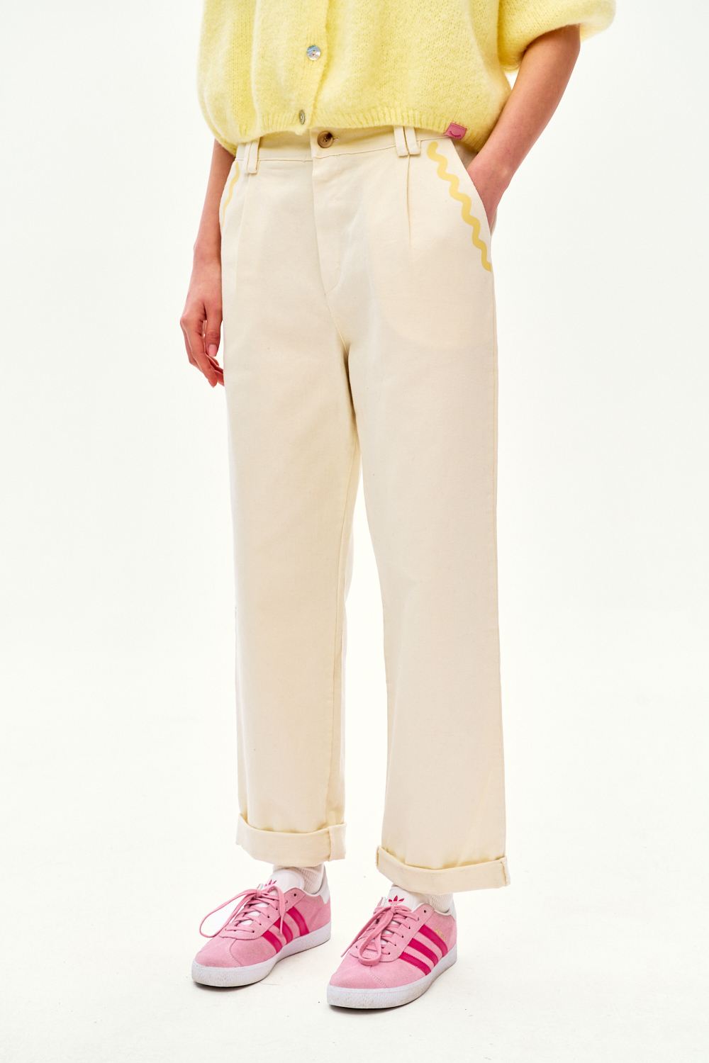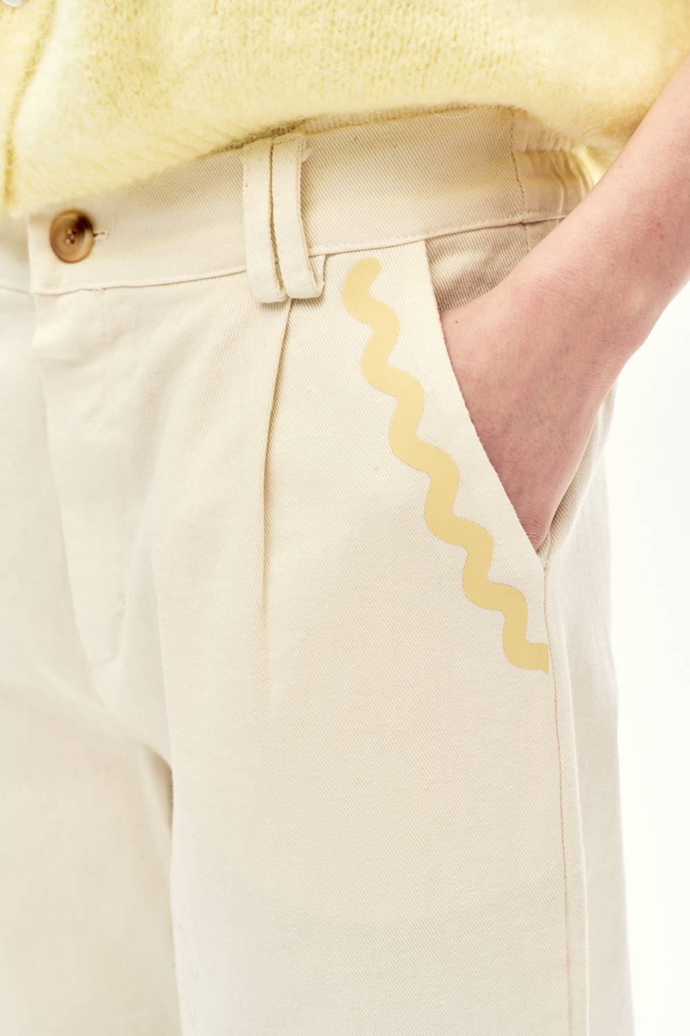 Te spodnie świetnie wyglądają w połączeniu z kolorowymi t-shirtami lub lnianą koszulą. Są bazą, która rozświetli każdą stylizację i nada jej lekkości.