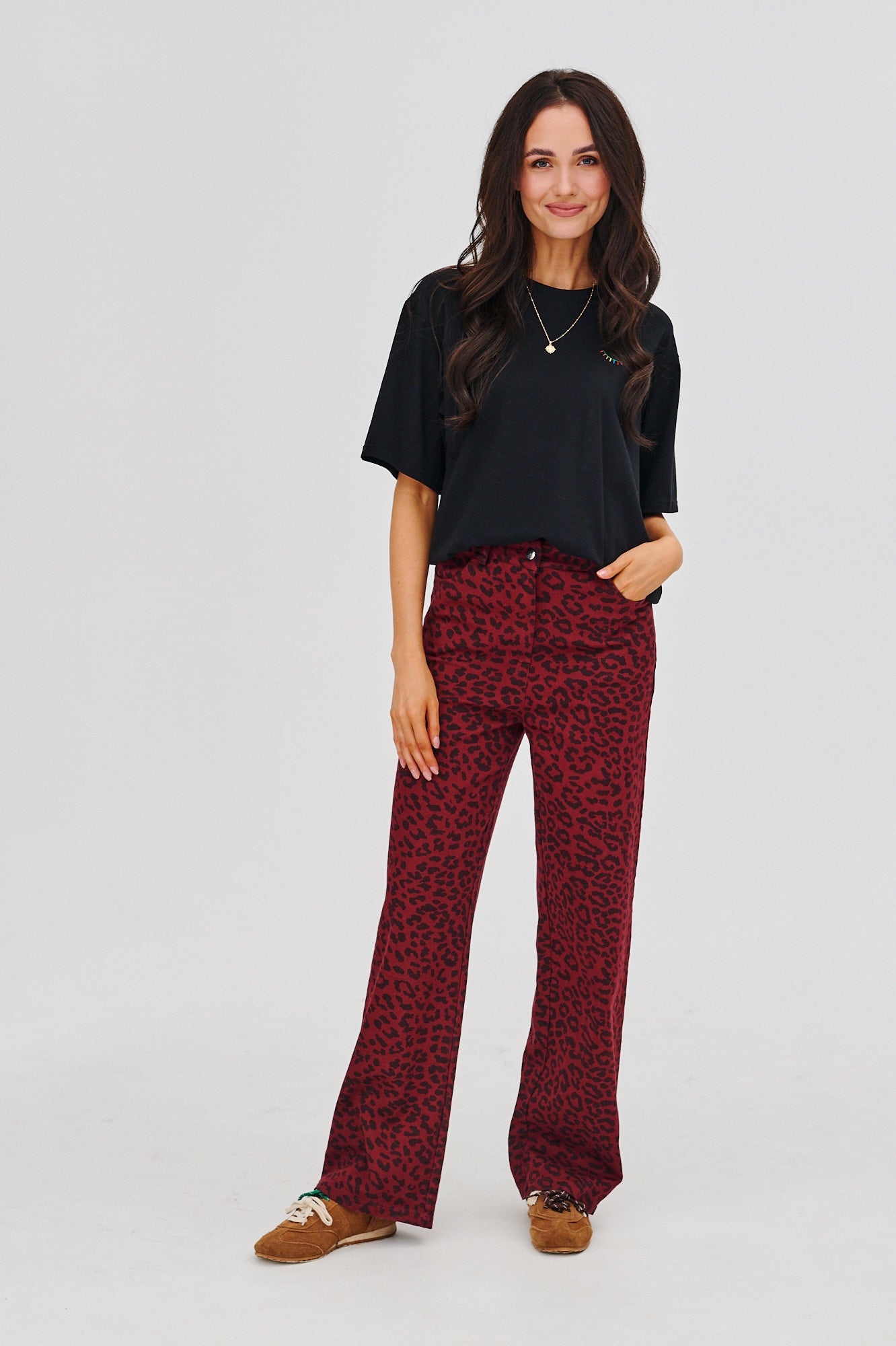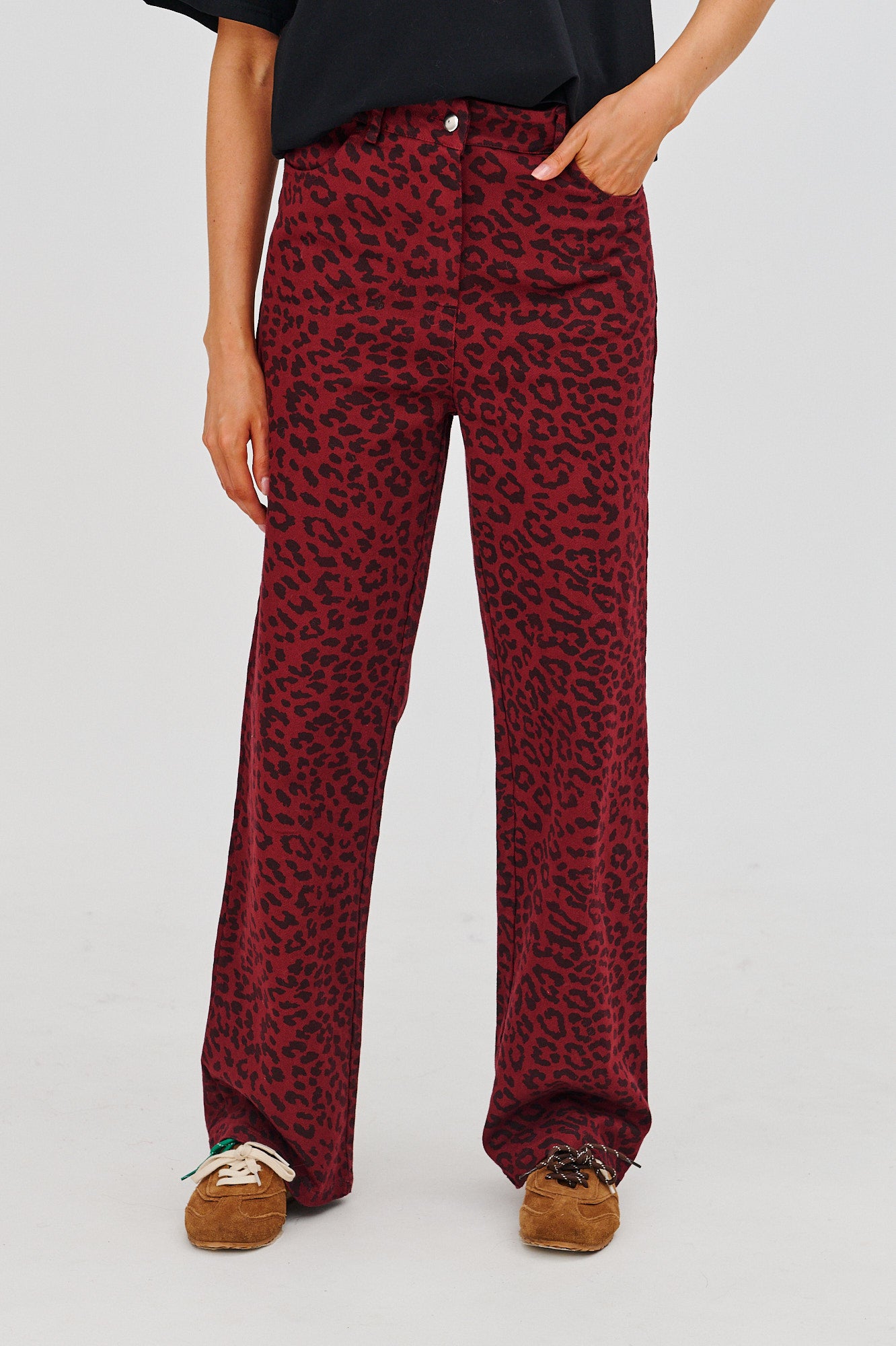 Spodnie jeansowe Ruby Roar to model dla kobiet, które nie boją się wyrażać siebie i swojego charakteru poprzez modę. Te wyjątkowe jeansy w głębokim, burgundowym kolorze ze zwierzęcym wzorem, inspirowanym cętkami, dodadzą Twojej stylizacji odwagi i energii. Wykonane z wysokiej jakości materiału, są jednocześnie wygodne i trwałe, idealne na co dzień i na wieczorne wyjścia.