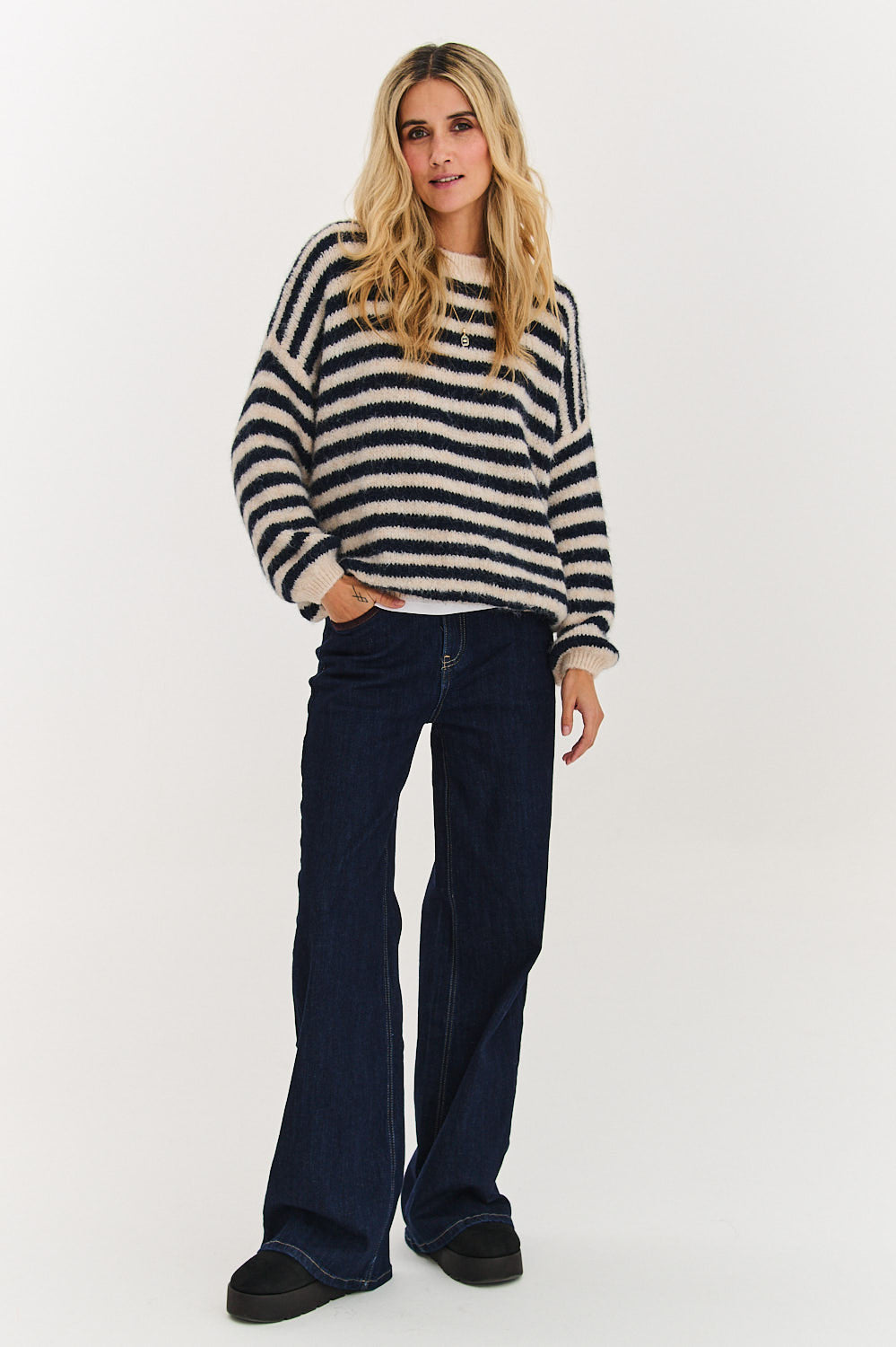 Jeansy Shades of Quiet to idealna baza dla Twojej szafy. Klasyczny krój z prostą, długą nogawką, który pięknie wydłuża sylwetkę. Wykonane z wysokiej jakości, ciemnego denimu, pasują do wszystkiego.