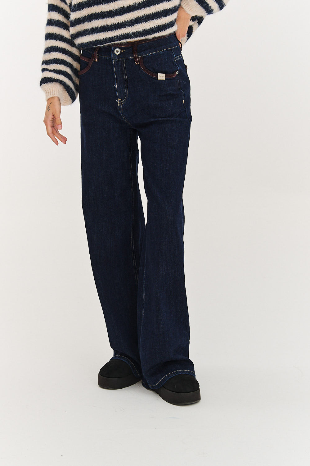 Tym, co je wyróżnia, są staranne detale: kontrastowe, brązowe przeszycia, które podkreślają ich konstrukcję, oraz małe, haftowane akcenty na kieszeniach (oko i serce). To spodnie, które założysz zarówno do eleganckiej koszuli, jak i do luźnego swetra.