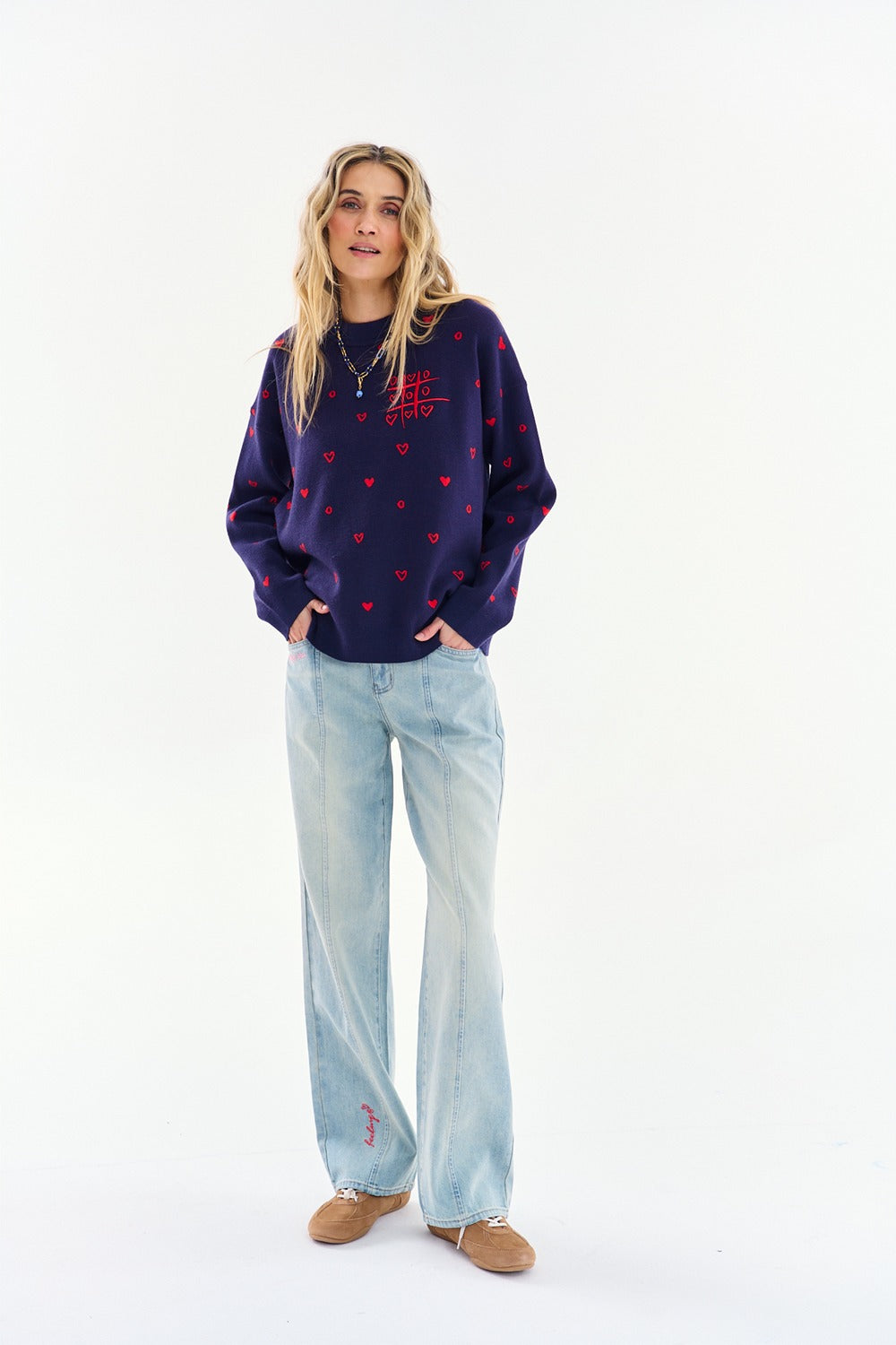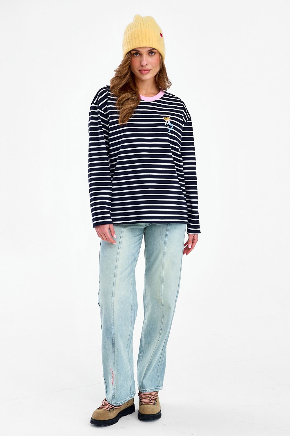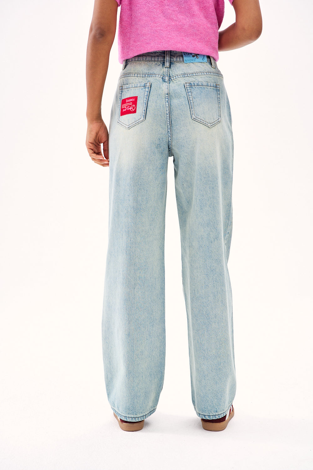 Spodnie jeansowe Unplanned Romance to powrót do estetyki lat 90. w romantycznym wydaniu. Jasny jeans o kroju wide leg został ozdobiony różowymi haftami: wisienkami, napisem "feelings" oraz naszywką na tylnej kieszeni. Charakterystyczne przeszycia wzdłuż nogawek optycznie wysmuklają sylwetkę.