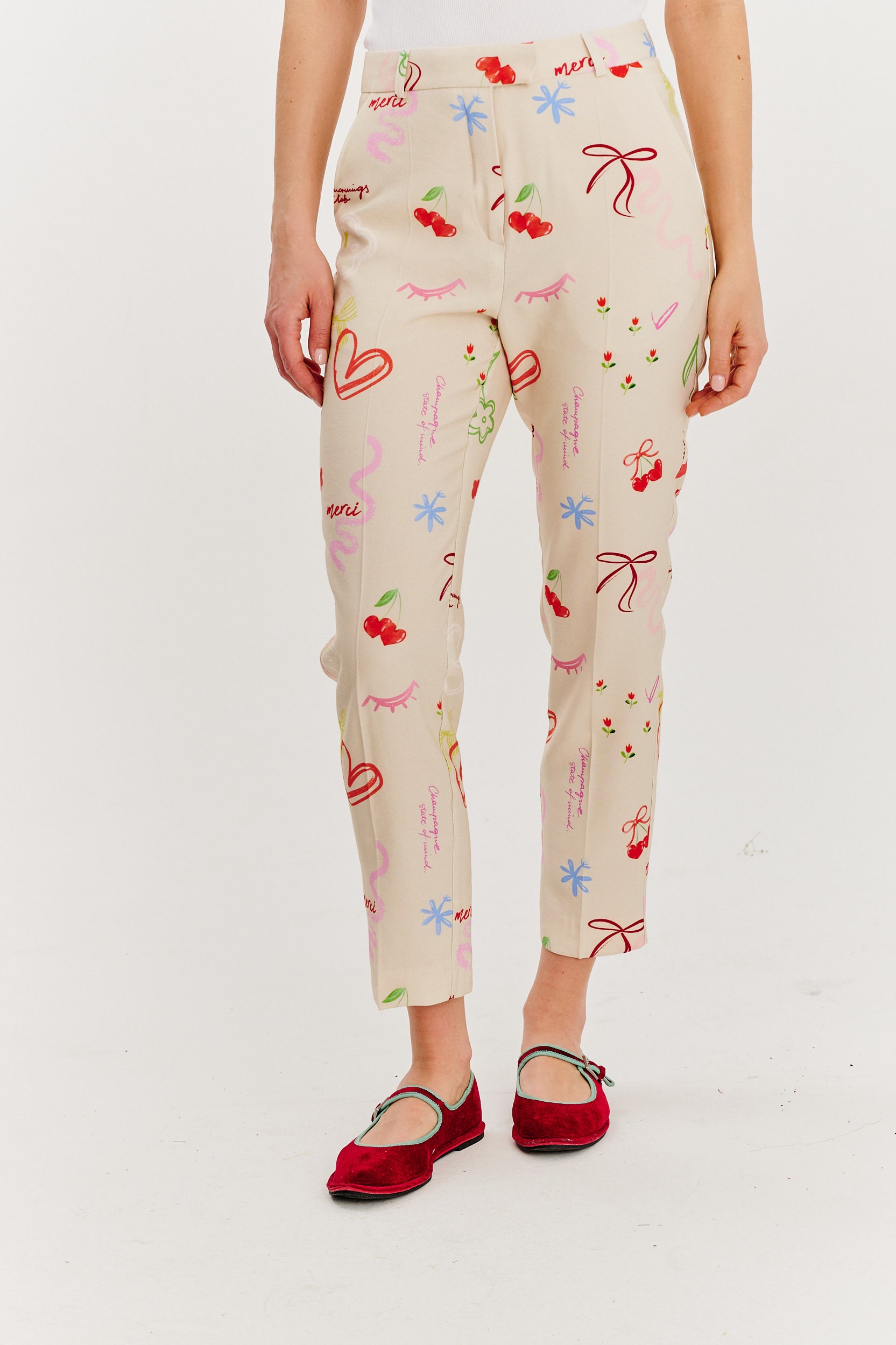 Wyobraź sobie poranek bez pośpiechu, z kawą w dłoni i miękkim światłem wpadającym przez okno – dokładnie taki klimat niosą ze sobą spodnie Lazy Mornings. Beżowa baza pokryta pastelowymi rysunkami, jakby ktoś spontanicznie zanotowała myśli i uczucia prosto na tkaninie: serduszka, wiśnie, kokardki i kwiaty, które przywołują beztroskę i kobiecą energię.