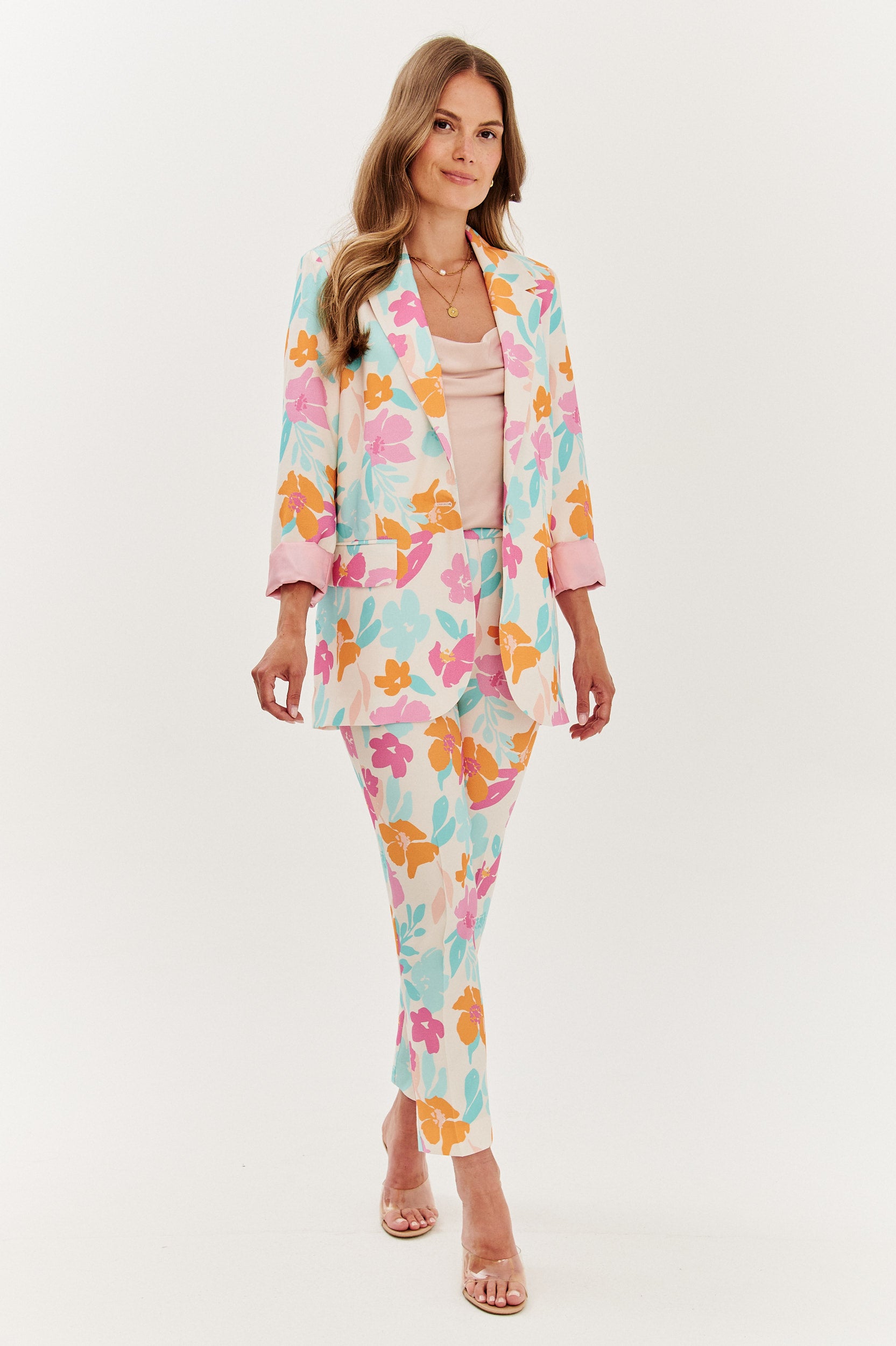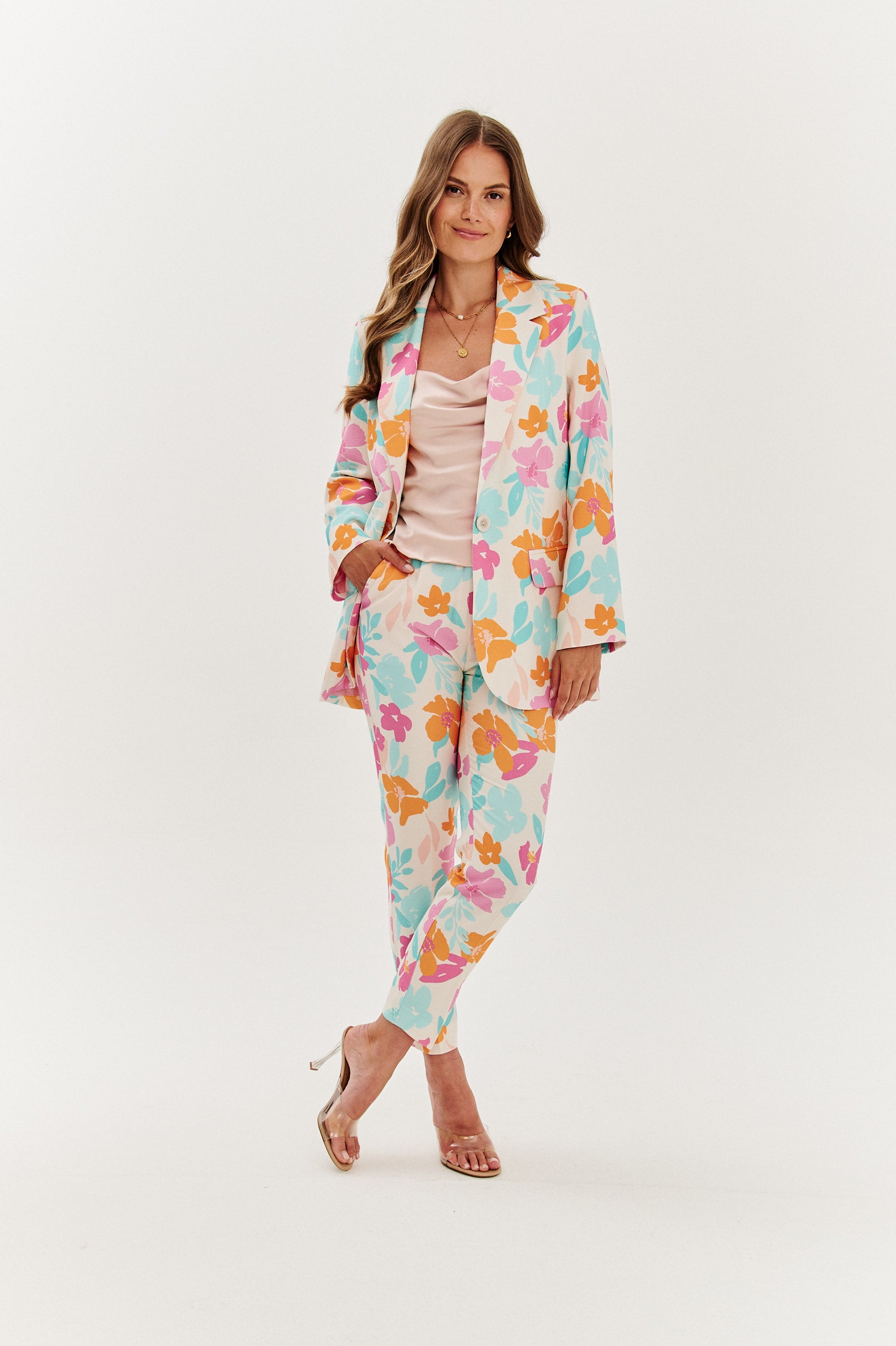 Model o prostym kroju z delikatnym zwężeniem ku dołowi, ozdobiony wyrazistym, kwiatowym printem w odcieniach różu, pomarańczu i turkusu. Spodnie mają klasyczny pas z szlufkami, zapięcie z przodu i kieszenie z tyłu – dzięki czemu łączą wygodę noszenia z eleganckim wykończeniem. Kwiatowy motyw dodaje im lekkości i optymizmu, idealnie wpisując się w wakacyjny klimat.