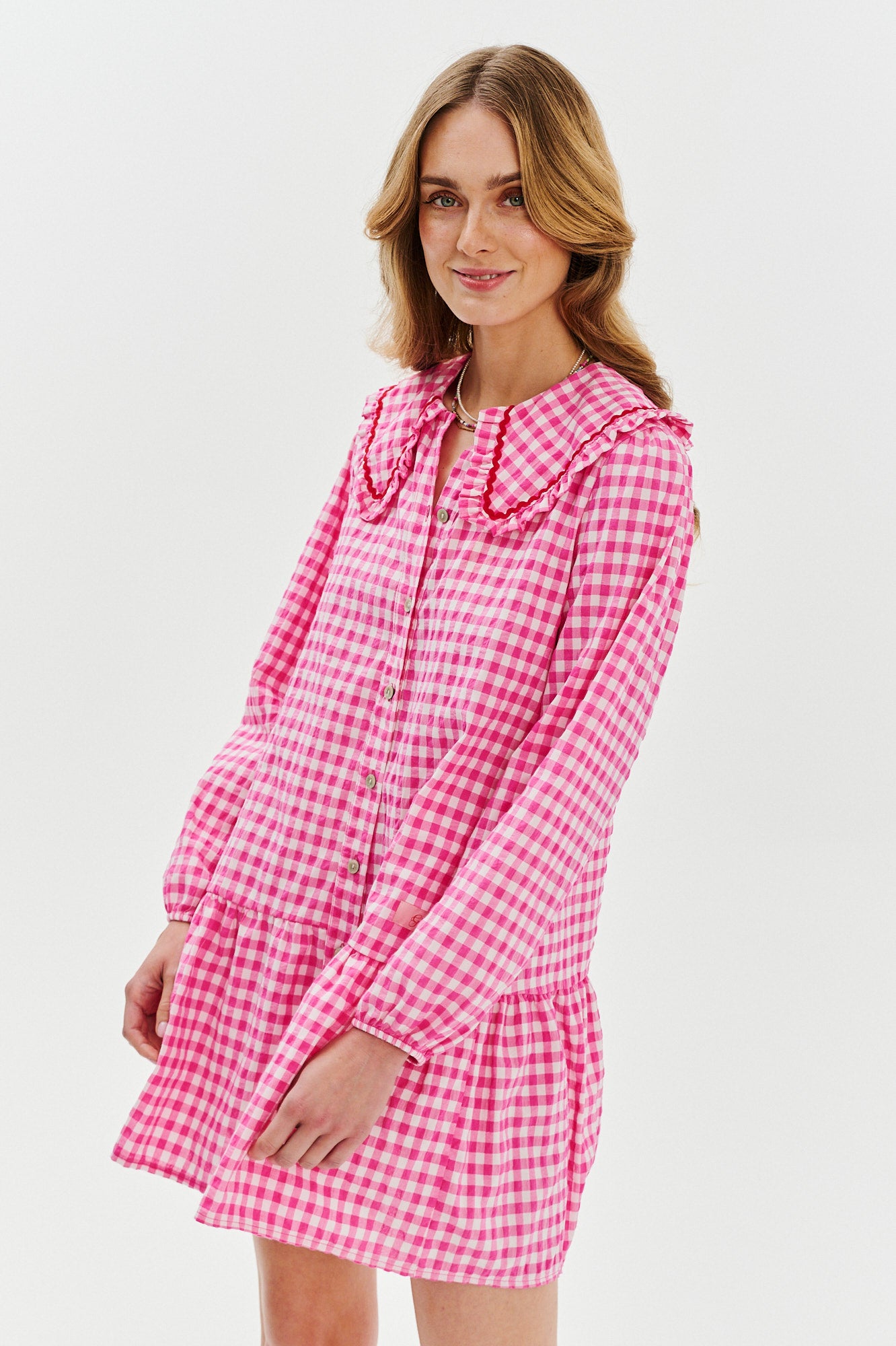 Sukienka Blush Power to propozycja, która łączy w sobie urok klasycznego kroju z dziewczęcym pazurem. Uszyta z bawełnianej tkaniny w różową kratkę, zachwyca dekoracyjnym kołnierzem ozdobionym falbanką i kontrastową tasiemką. Perłowe guziki dodają jej elegancji, a delikatne marszczenie na dole sprawia, że pięknie układa się w ruchu.