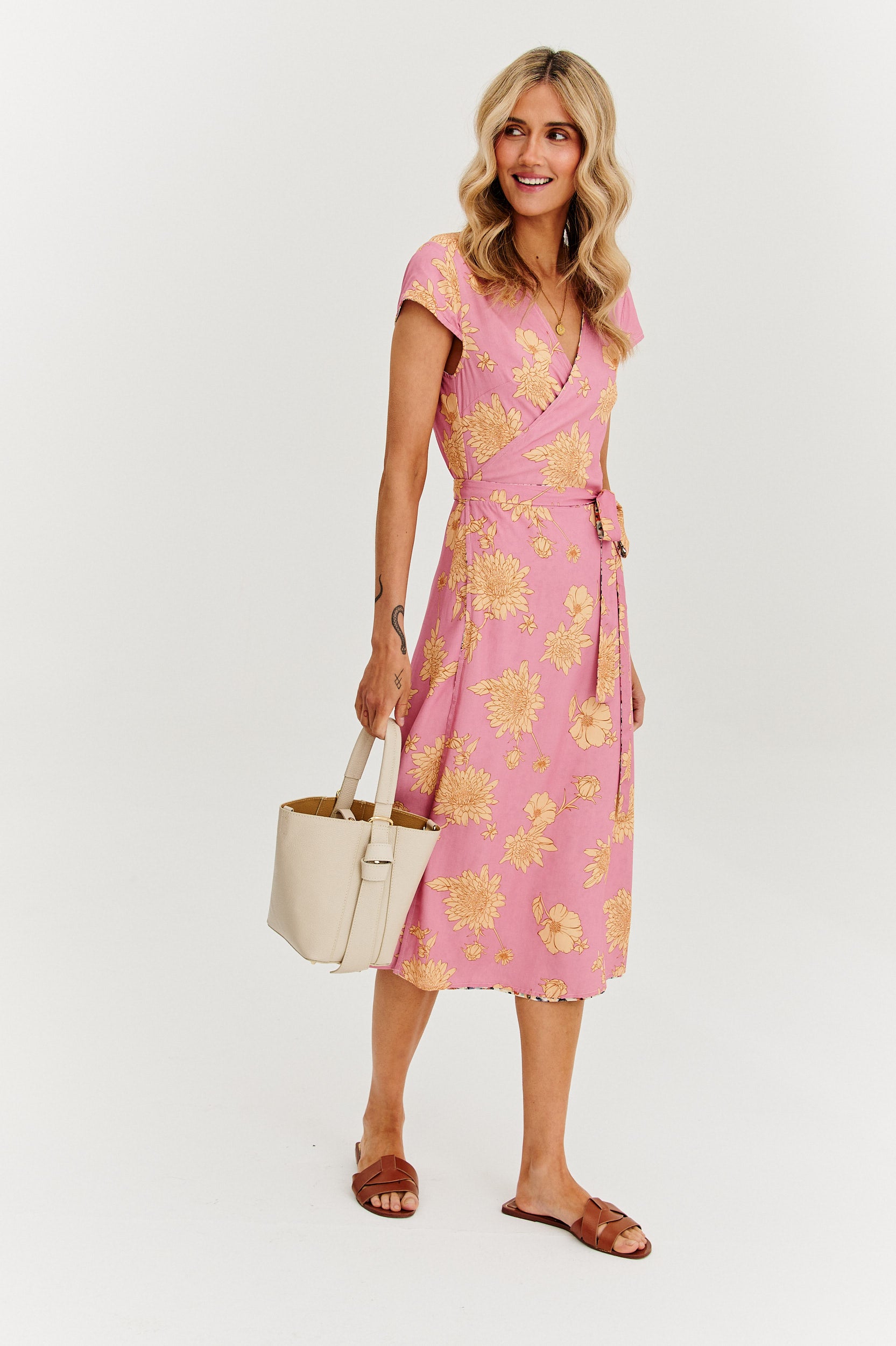 Kopertowy krój pięknie podkreśla talię, a zwiewna wiskoza przyjemnie układa się na sylwetce. To idealna opcja na wyjazd – wystarczy odwrócić ją na drugą stronę, by stworzyć nowy look bez zmieniania outfitu.