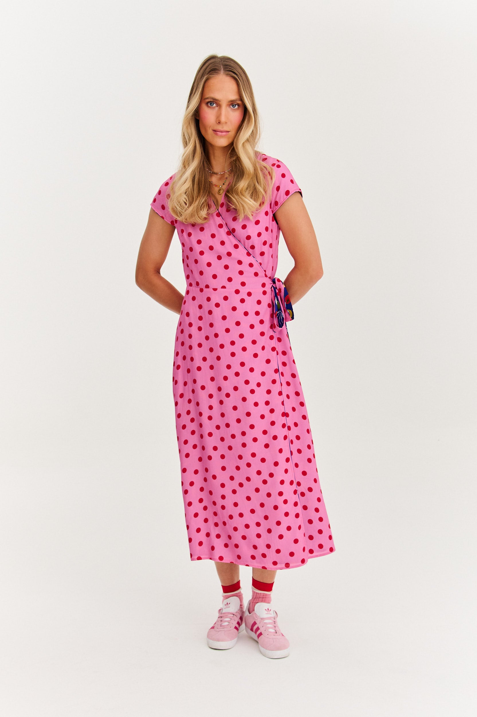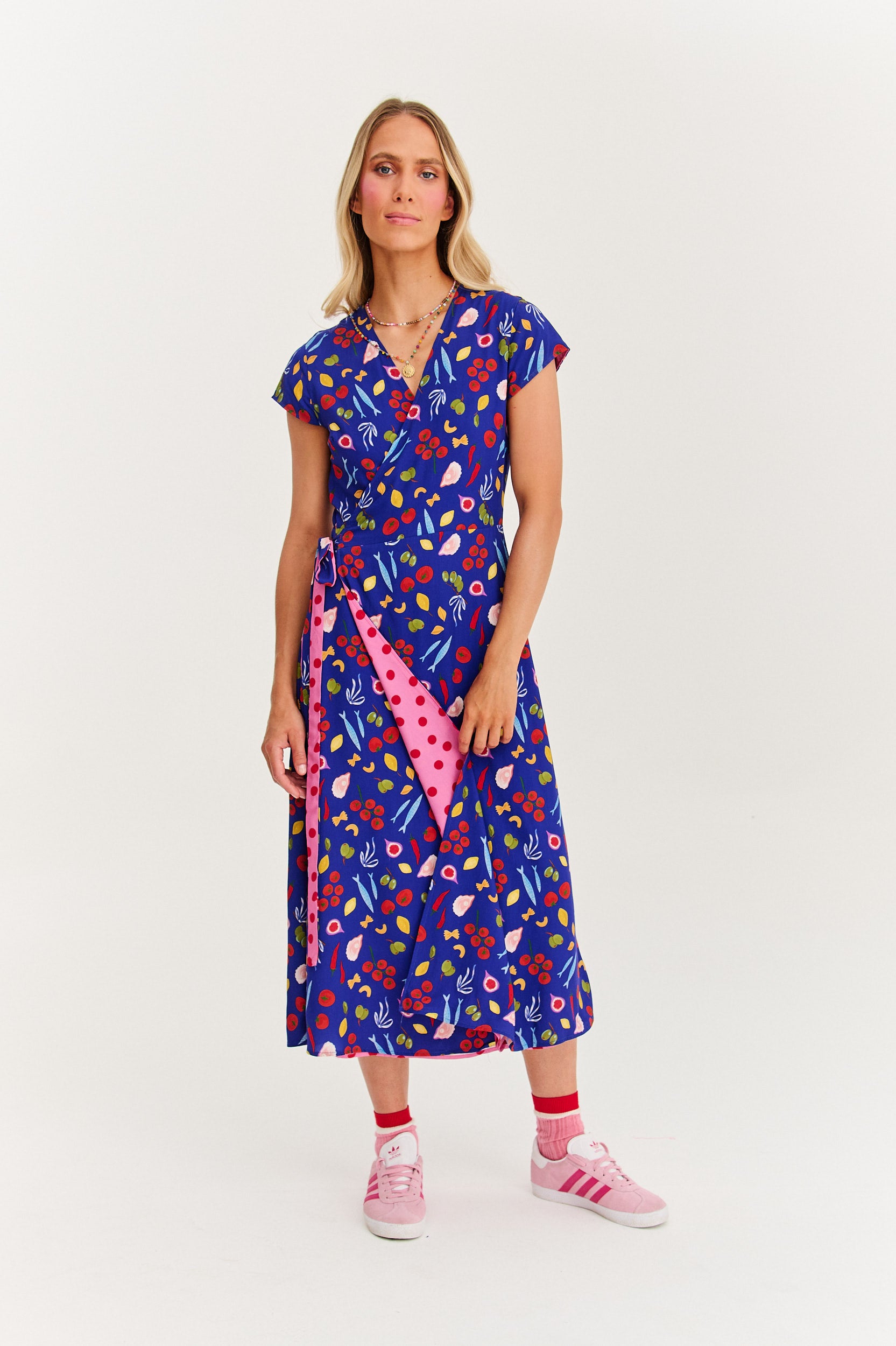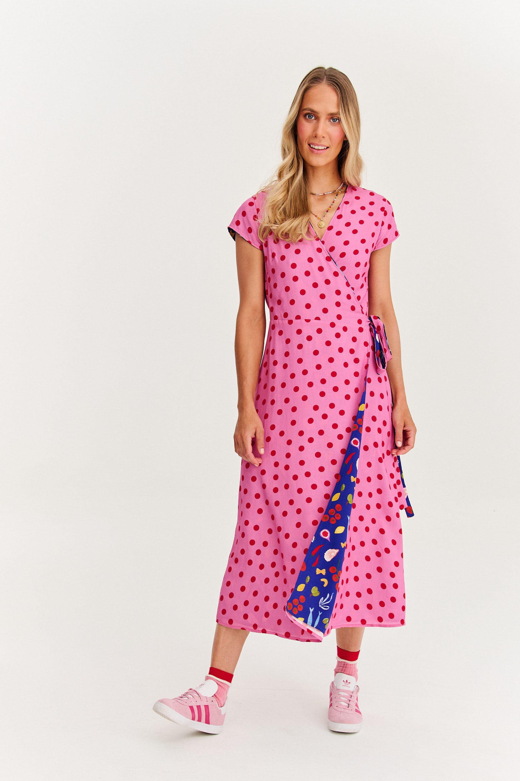 Model o długości midi, z kobiecym dekoltem kopertowym i wiązaniem w talii. Obie strony zostały uszyte z matowej wiskozy, która pięknie się układa i daje uczucie lekkości. Idealna zarówno na nadmorski spacer w espadrylach, jak i kolację w stylu dolce vita – wystarczy tylko odwrócić materiał.