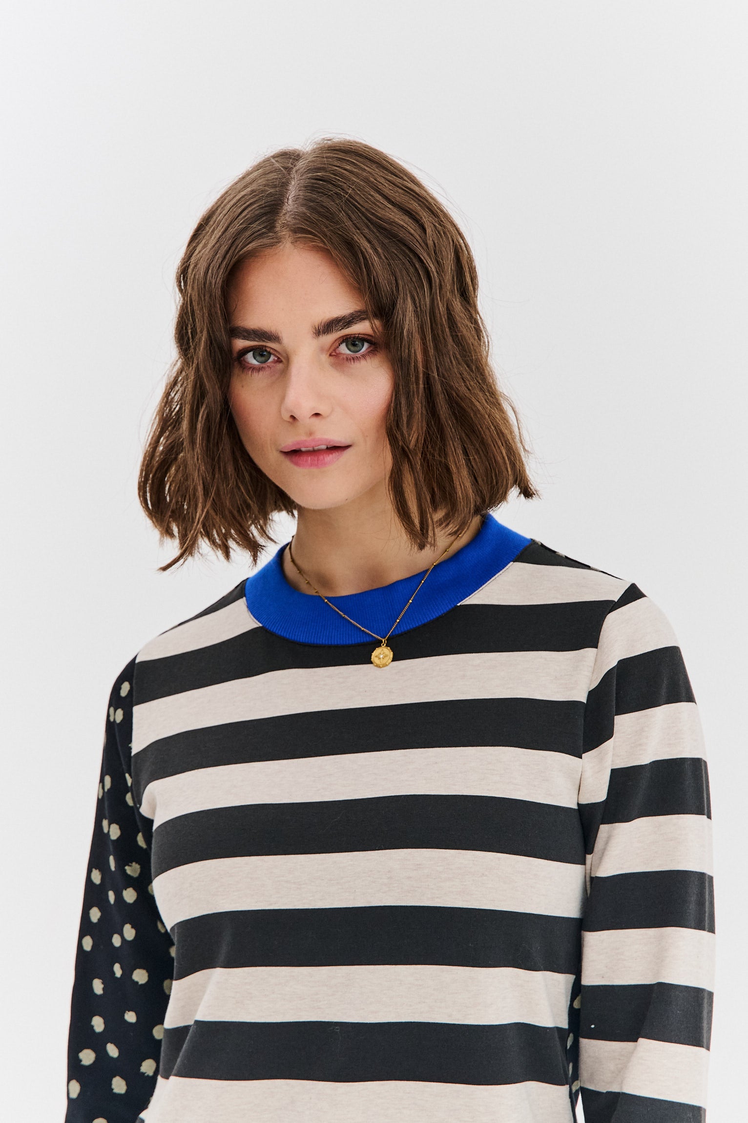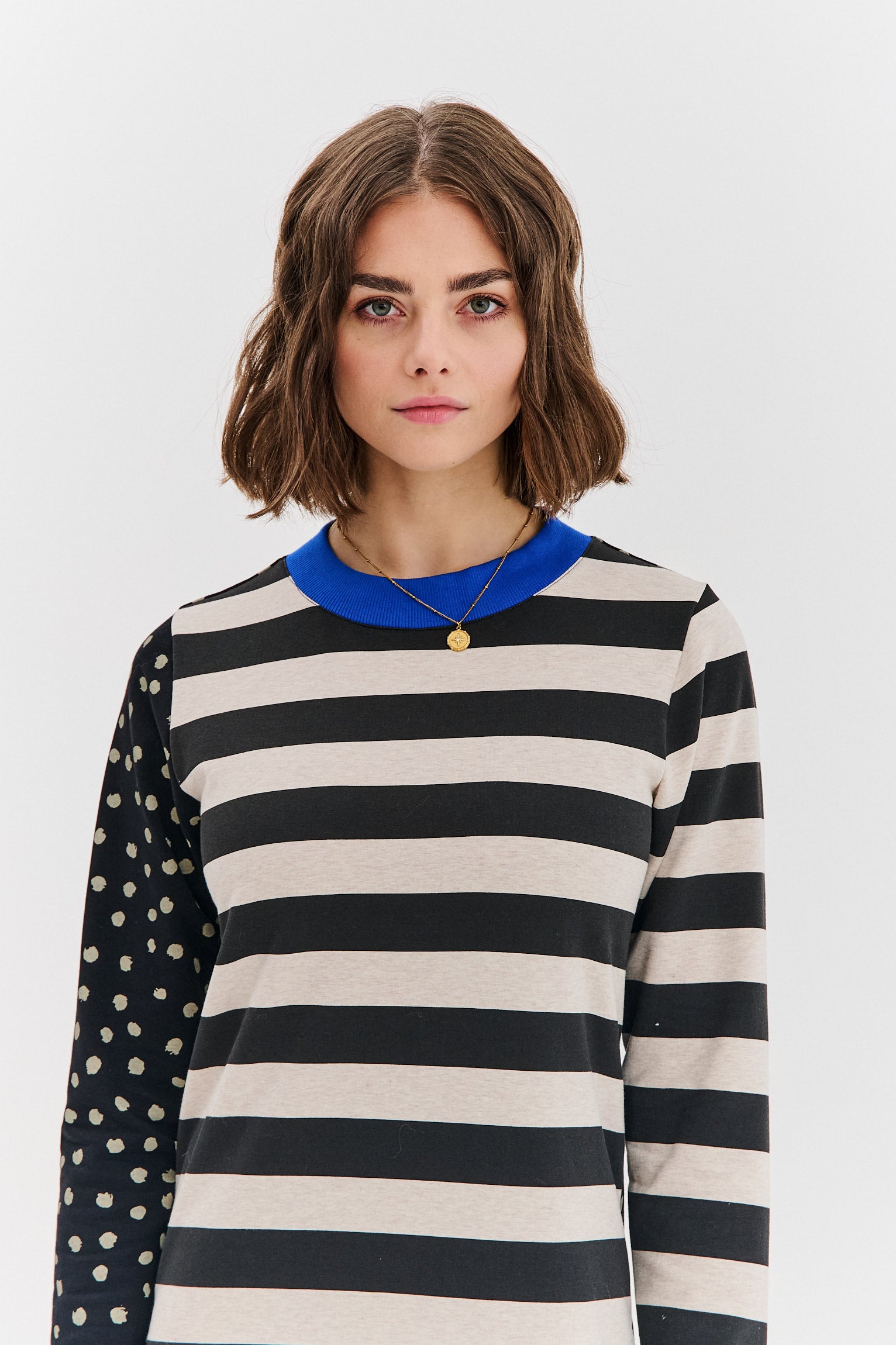 Sukienka dzianinowa Day to Night z bawełny to model dla kobiety, która nie boi się modowych eksperymentów. Projektanci połączyli w niej dwa ponadczasowe wzory – paski i kropki – tworząc niepowtarzalną i dynamiczną całość. To sukienka, która wygląda inaczej z każdej perspektywy.