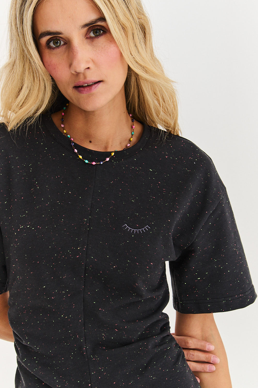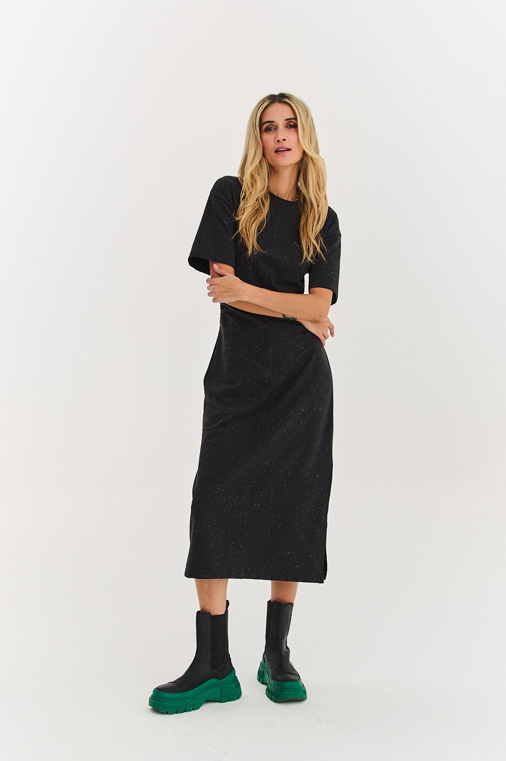 Sukienka Lost Nomad to definicja miejskiego komfortu. Model ten to przedłużona forma T-shirta o długości midi, wykonana z unikalnej dzianiny dresowej. Ciemny, grafitowy melanż ożywiony jest kolorowymi, neonowymi drobinkami, co nadaje jej charakteru.