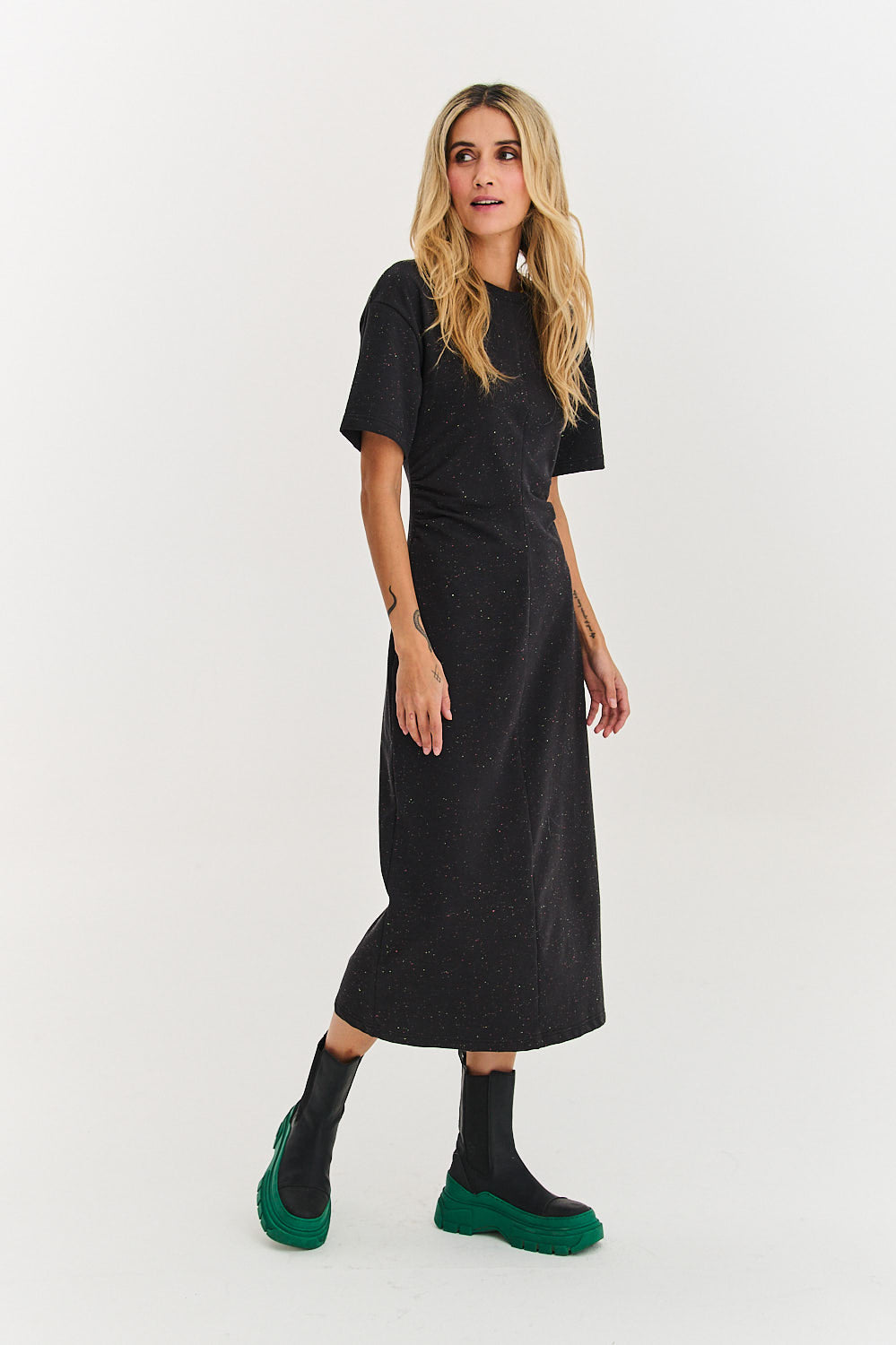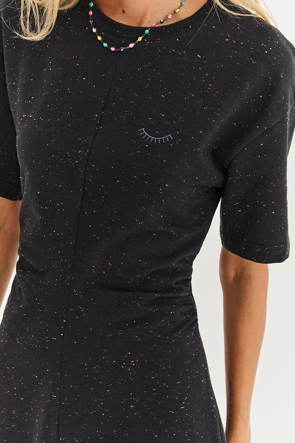 Sukienka Lost Nomad to definicja miejskiego komfortu. Model ten to przedłużona forma T-shirta o długości midi, wykonana z unikalnej dzianiny dresowej. Ciemny, grafitowy melanż ożywiony jest kolorowymi, neonowymi drobinkami, co nadaje jej charakteru.