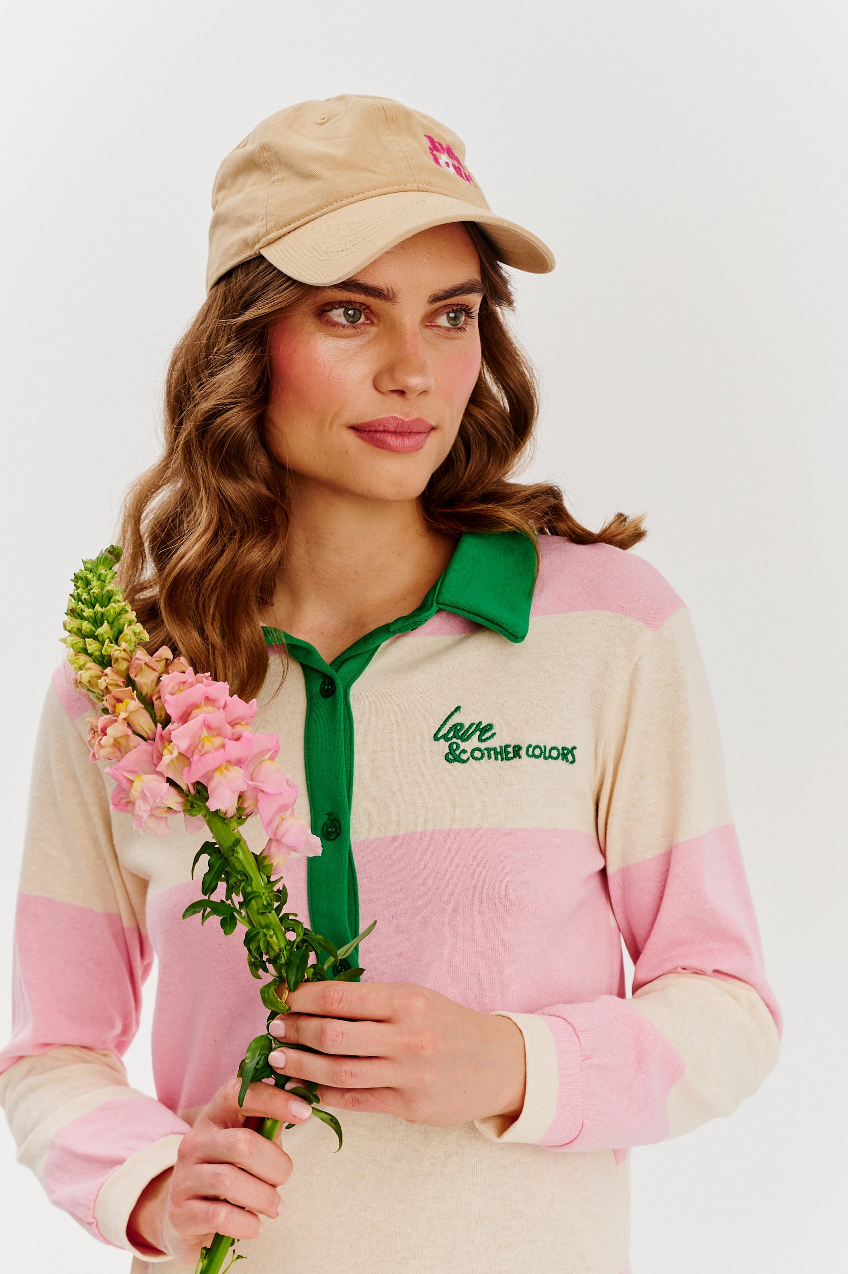 Sukienka dzianinowa polo Blossom Haze to idealne połączenie casualowego luzu z subtelną elegancją. Oversize’owy krój i długie rękawy zapewniają komfort noszenia, a klasyczny kołnierzyk polo w odcieniu zieleni dodaje jej charakteru. Szerokie, poziome pasy w delikatnym różu i kremie przywołują na myśl beztroskie, wiosenne poranki i podkreślają unikalny styl.