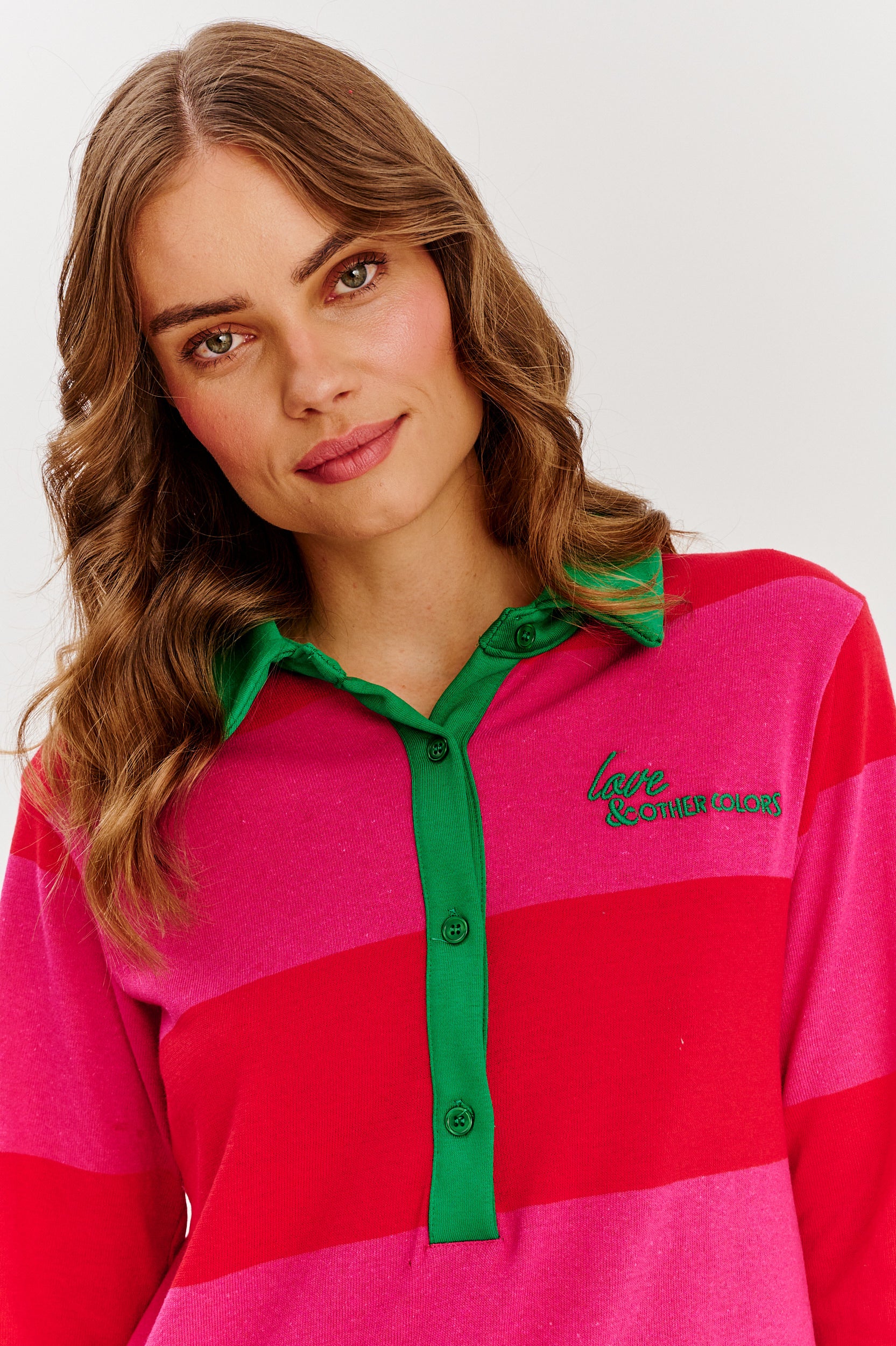 Sukienka dzianinowa polo No Limits to propozycja dla kobiet, które lubią wyraziste kolory i sportowy luz w modnym wydaniu. Intensywne pasy w odcieniach fuksji i czerwieni dodają energii i wyróżniają się na tle klasycznych fasonów. Zielony kołnierzyk polo nadaje jej unikalnego charakteru, tworząc ciekawy kontrast z resztą sukienki.