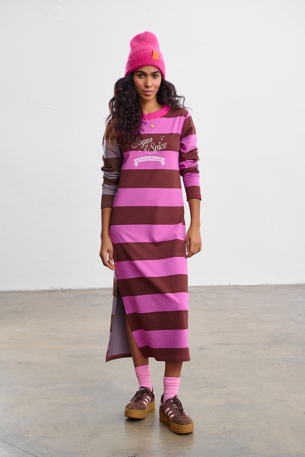 Sukienka dzianinowa Sugar & Spice to propozycja dla kobiet, które lubią bawić się modą. Długa sukienka o prostym kroju wykonana jest z miękkiej dzianiny w szerokie, poziome pasy w kontrastowych kolorach. Boczne rozcięcia zapewniają swobodę ruchów.