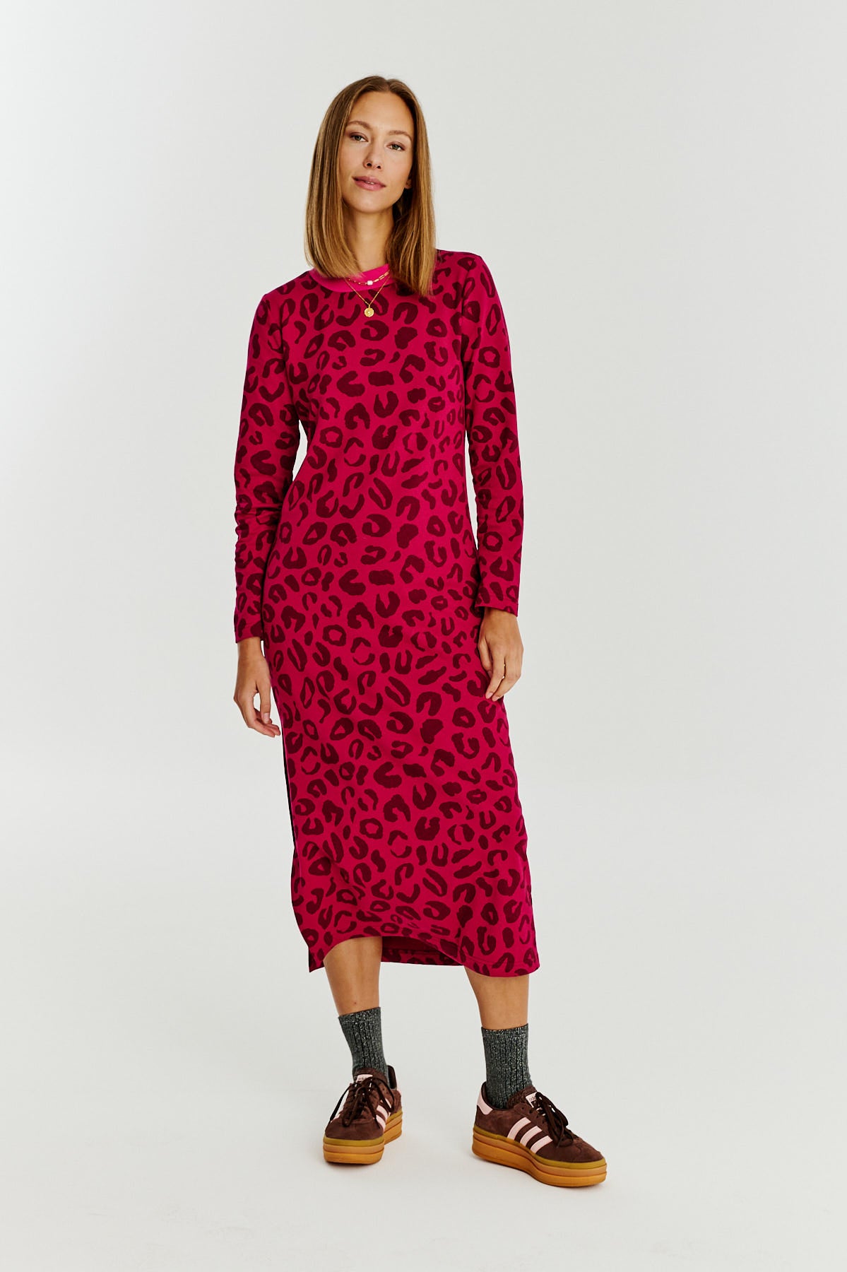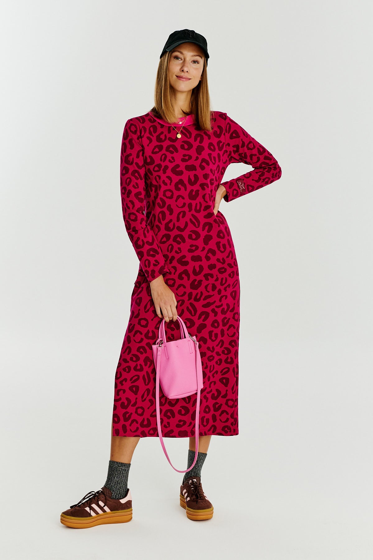 Sukienka dzianinowa Wild Maroon to wyjątkowa propozycja dla miłośniczek odważnych wzorów i wygody. Wykonana z miękkiej dzianiny, ozdobiona jest wyrazistym, panterkowym printem w odcieniach głębokiej czerwieni i fioletu.