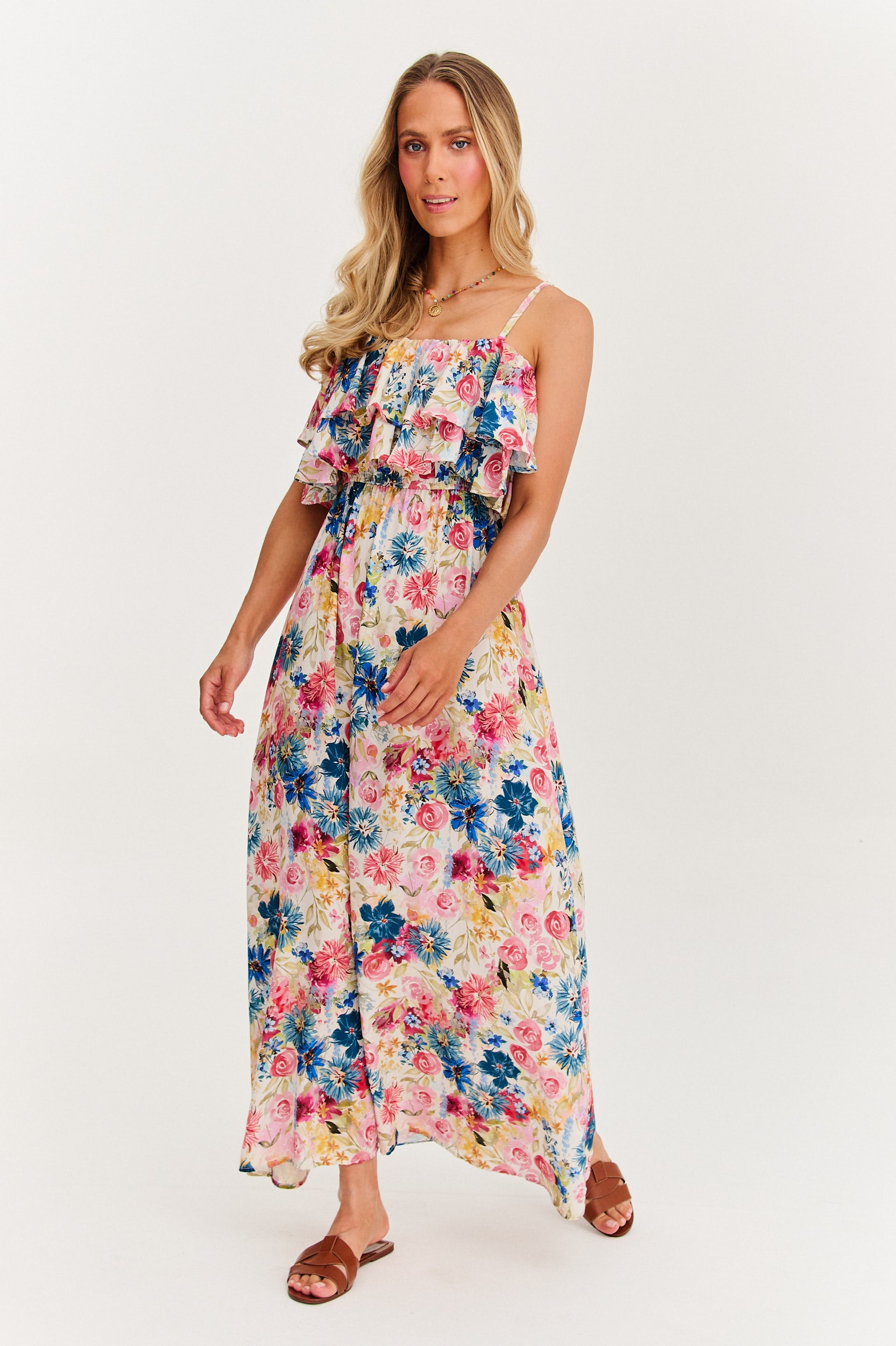 Model o długości midi, uszyty z matowej wiskozy, cudownie otula sylwetkę i zapewnia komfort nawet w najbardziej gorące dni. Elastyczna talia i cienkie ramiączka podtrzymujące górę sprawiają, że sukienka pięknie układa się na ciele, a jednocześnie daje swobodę ruchu. Noś ją z espadrylami i wiklinowym koszykiem lub z sandałkami i ulubioną biżuterią – za każdym razem wygląda spektakularnie.