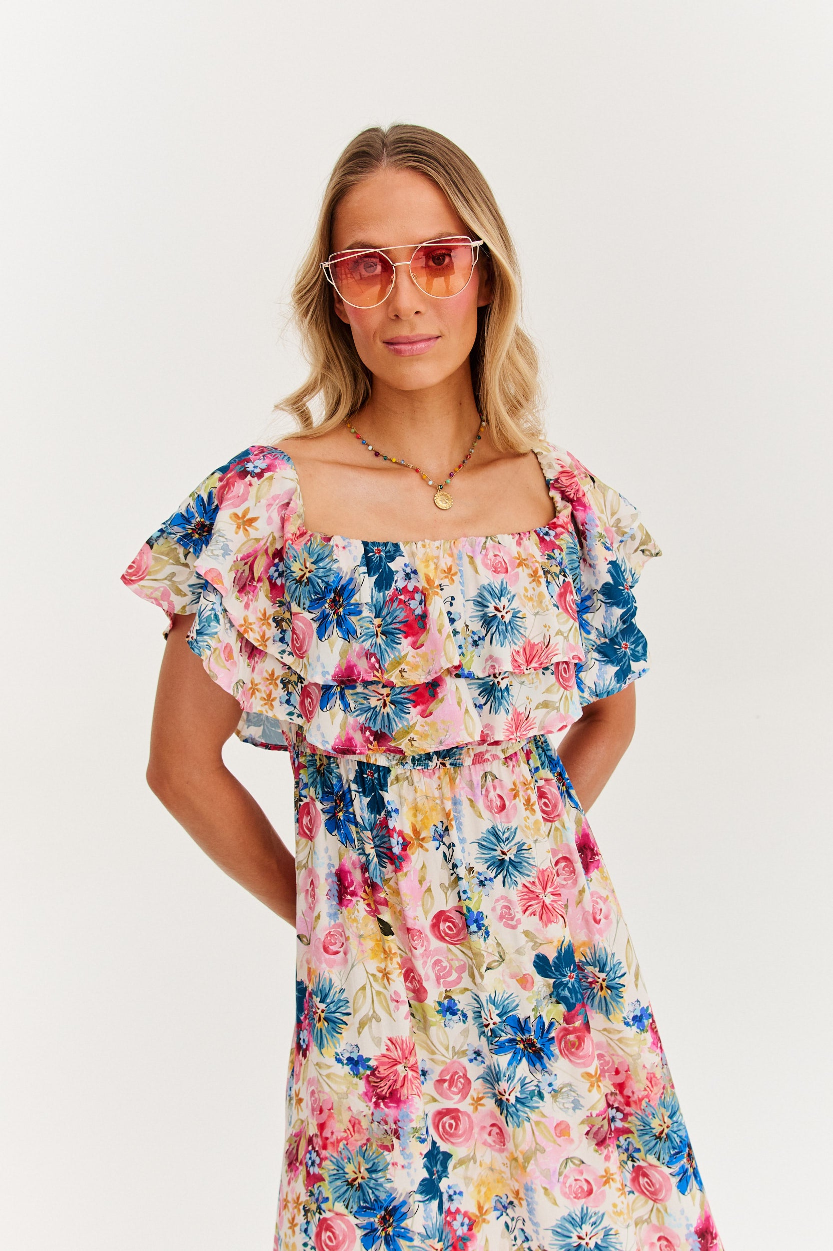 Sukienka hiszpanka Light Garden to kwintesencja letniej lekkości i kobiecego uroku. Jej romantyczny kwiatowy print przenosi myśli do ogrodu pełnego słońca i zapachu kwitnących róż, a falbana na dekolcie w stylu hiszpańskim dodaje zmysłowości i subtelnego luzu.