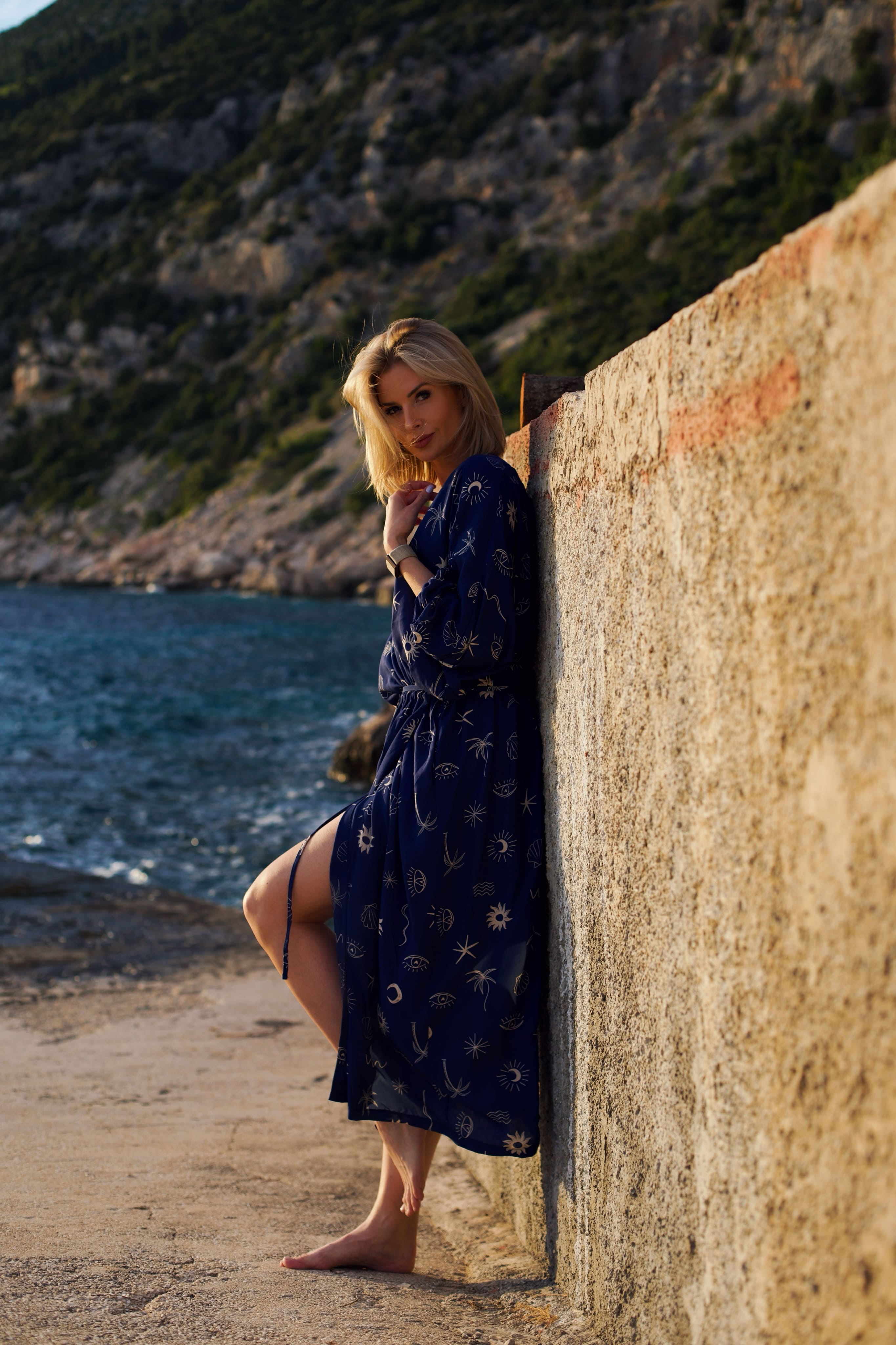Sukienka kimonowa Sea Spell to manifest wakacyjnej magii w wersji midi. Jej głęboki odcień granatu przywołuje na myśl nocne niebo nad morzem, a beżowe symbole — muszle, księżyce i słońca — snują opowieść o tajemniczych podróżach i letnich przygodach.