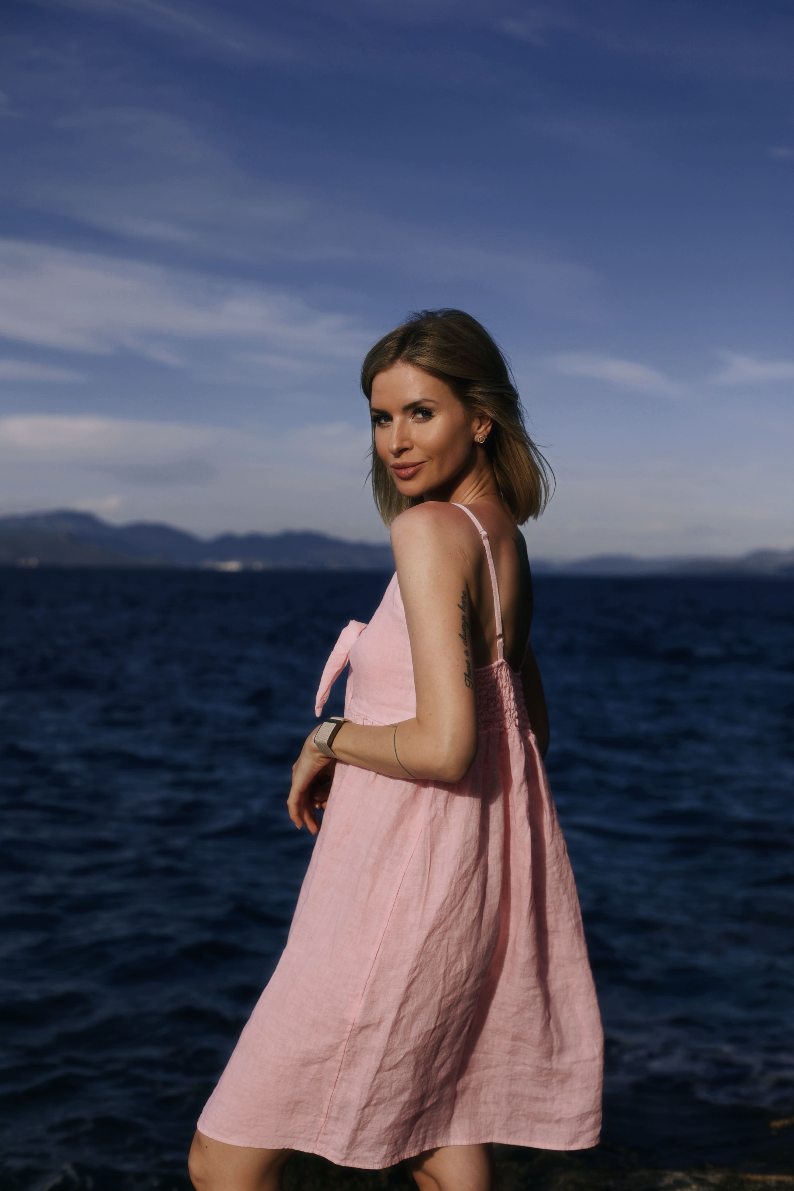 Sukienka lniana Sweet Memory to kwintesencja dziewczęcego uroku w letnim wydaniu. Delikatny róż, wiązanie na dekolcie i lekki fason sprawiają, że trudno się w niej nie zakochać. Wykonana z przewiewnego lnu, zapewnia wygodę i świeżość nawet w upalne dni.