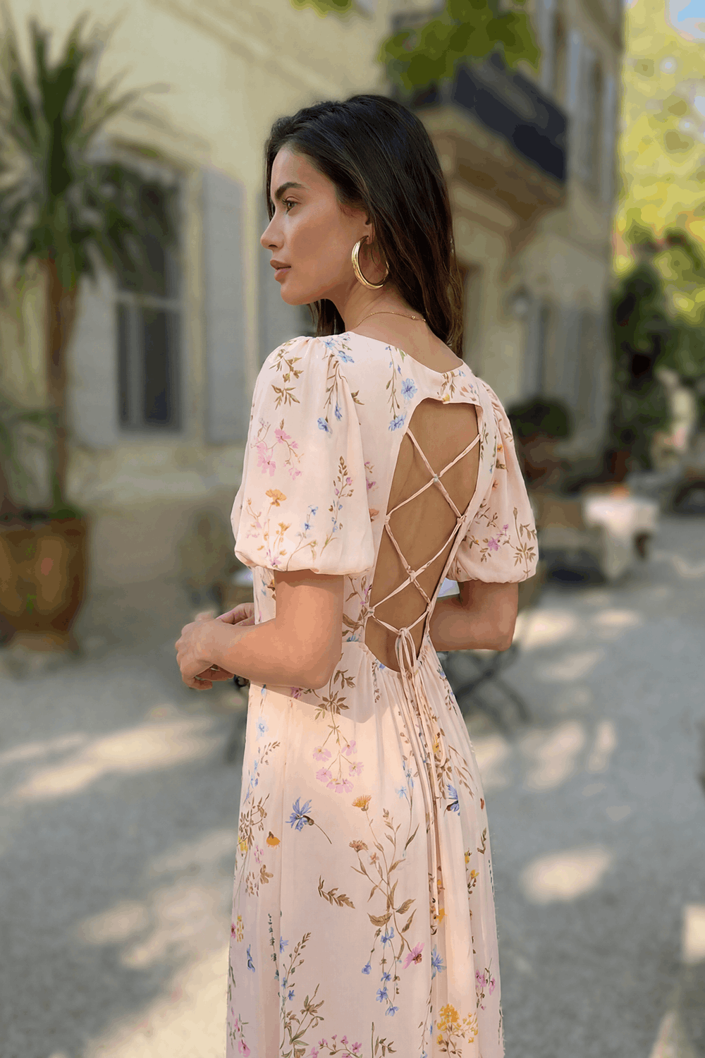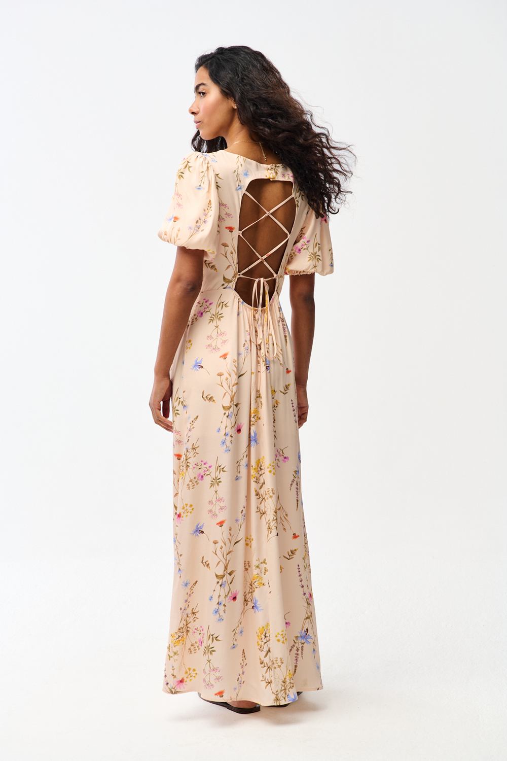 Sukienka Fairytale Garden to marzenie o wiecznym lecie zamknięte w formie maxi. Bufiaste rękawki i delikatny kwiatowy print na jasnym tle tworzą romantyczną całość. Największym atutem jest tył – głębokie wycięcie z dekoracyjnym sznurowaniem, które pozwala na idealne dopasowanie i zmysłowo eksponuje plecy.