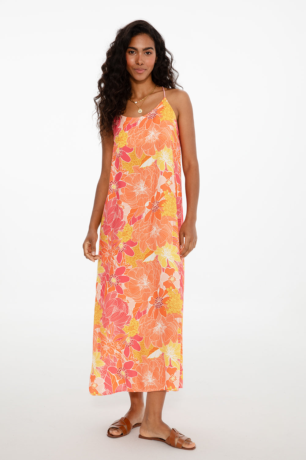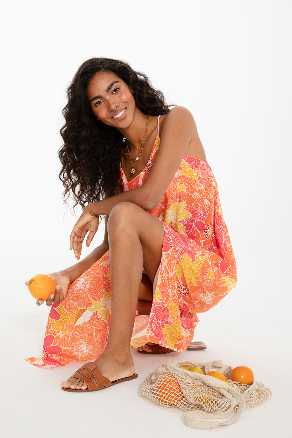 Sukienka maxi na ramiączkach Floral Heat to kwintesencja letniego romantyzmu i kobiecej energii. Drobne, kwiatowe printy w odcieniach różu, pomarańczy i żółci tworzą energetyczną, ale delikatną kompozycję – idealną na upalne dni i wieczory przy zachodzie słońca.