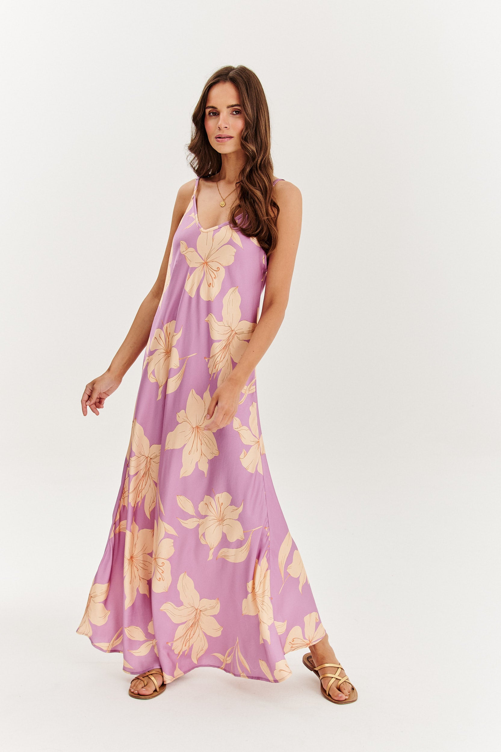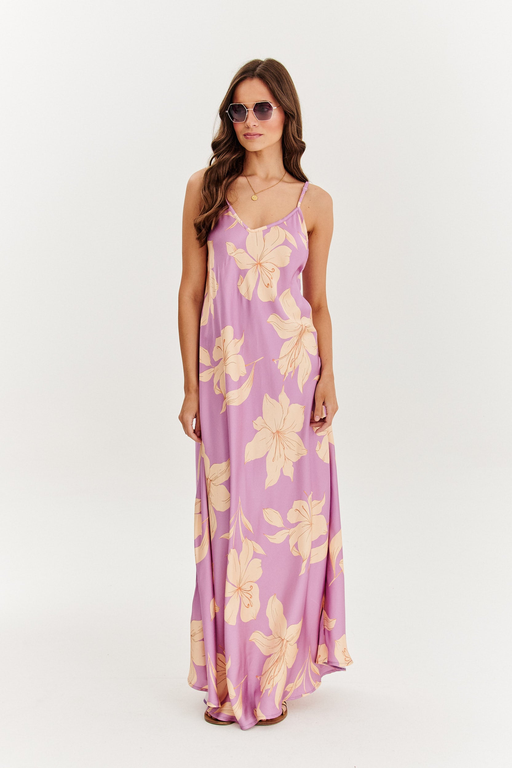 Sukienka maxi na ramiączkach Lila del Sol to zmysłowa i lekka propozycja dla miłośniczek kobiecych fasonów i subtelnych printów. Uszyta z wiskozy, pięknie układa się na sylwetce, a cienkie ramiączka i dekolt w kształcie litery V nadają jej delikatności i letniego charakteru.