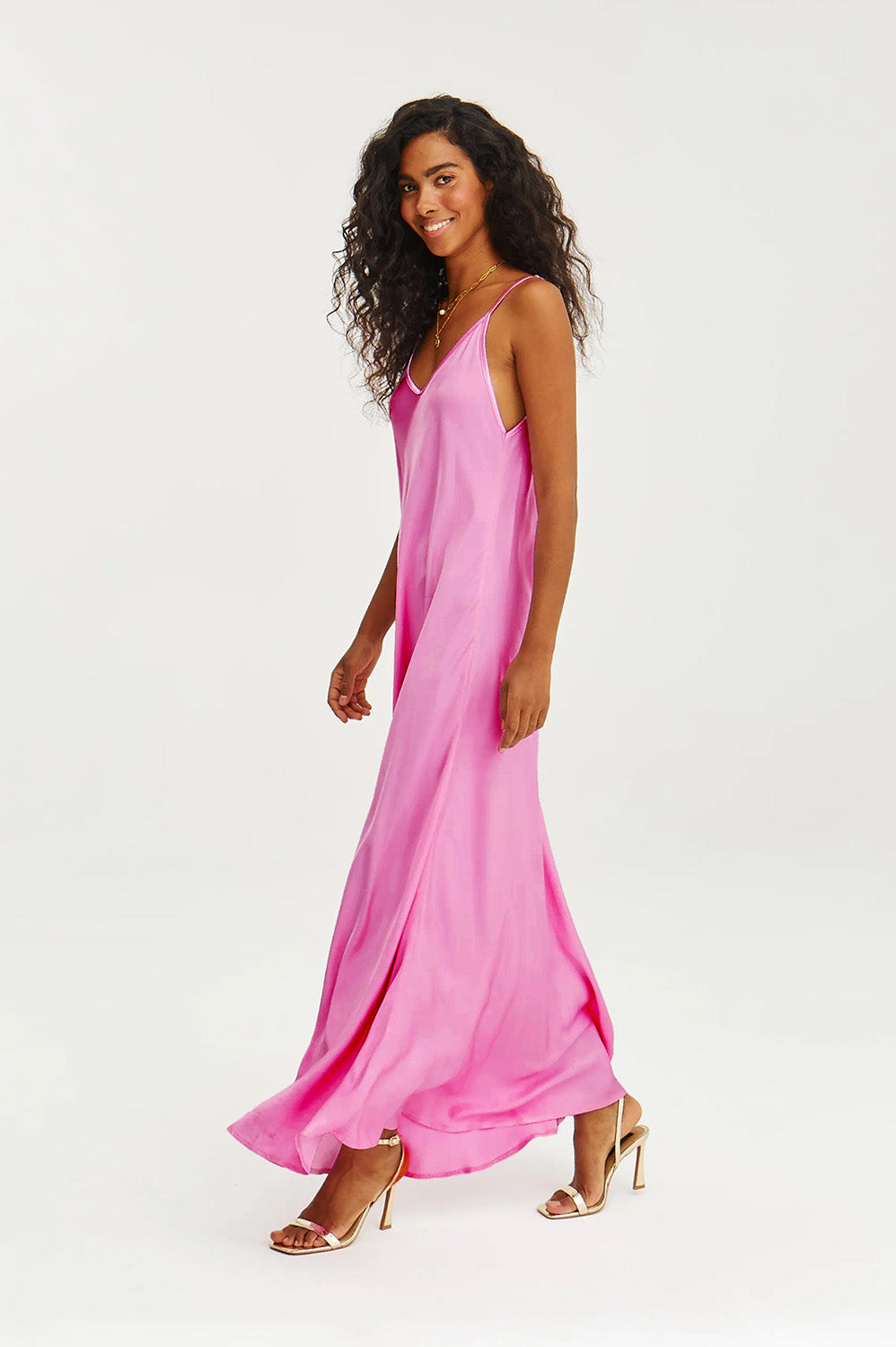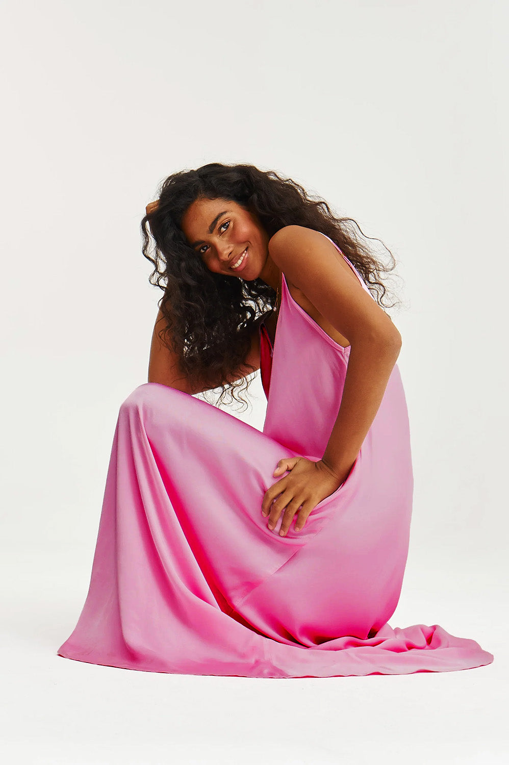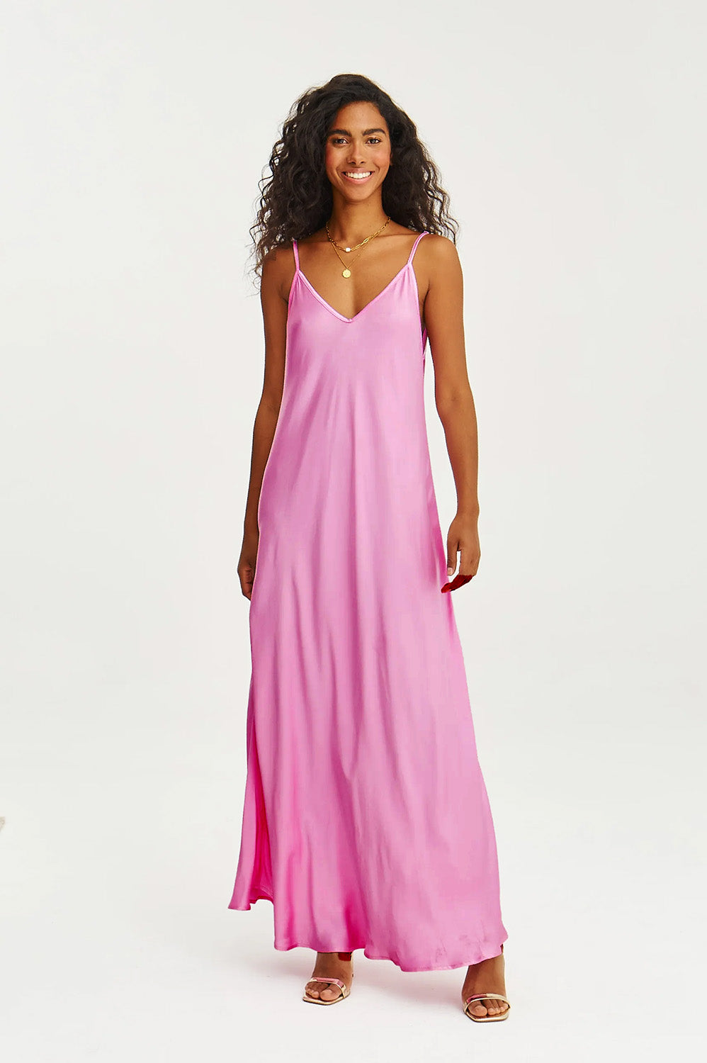 Zanurz się w letnim romansie z elegancją – sukienka maxi na ramiączkach Petunia to delikatność, która przyciąga spojrzenia. Jej subtelny różowy kolor i lejąca się tkanina układają się na sylwetce jak najpiękniejsza opowieść o kobiecości.