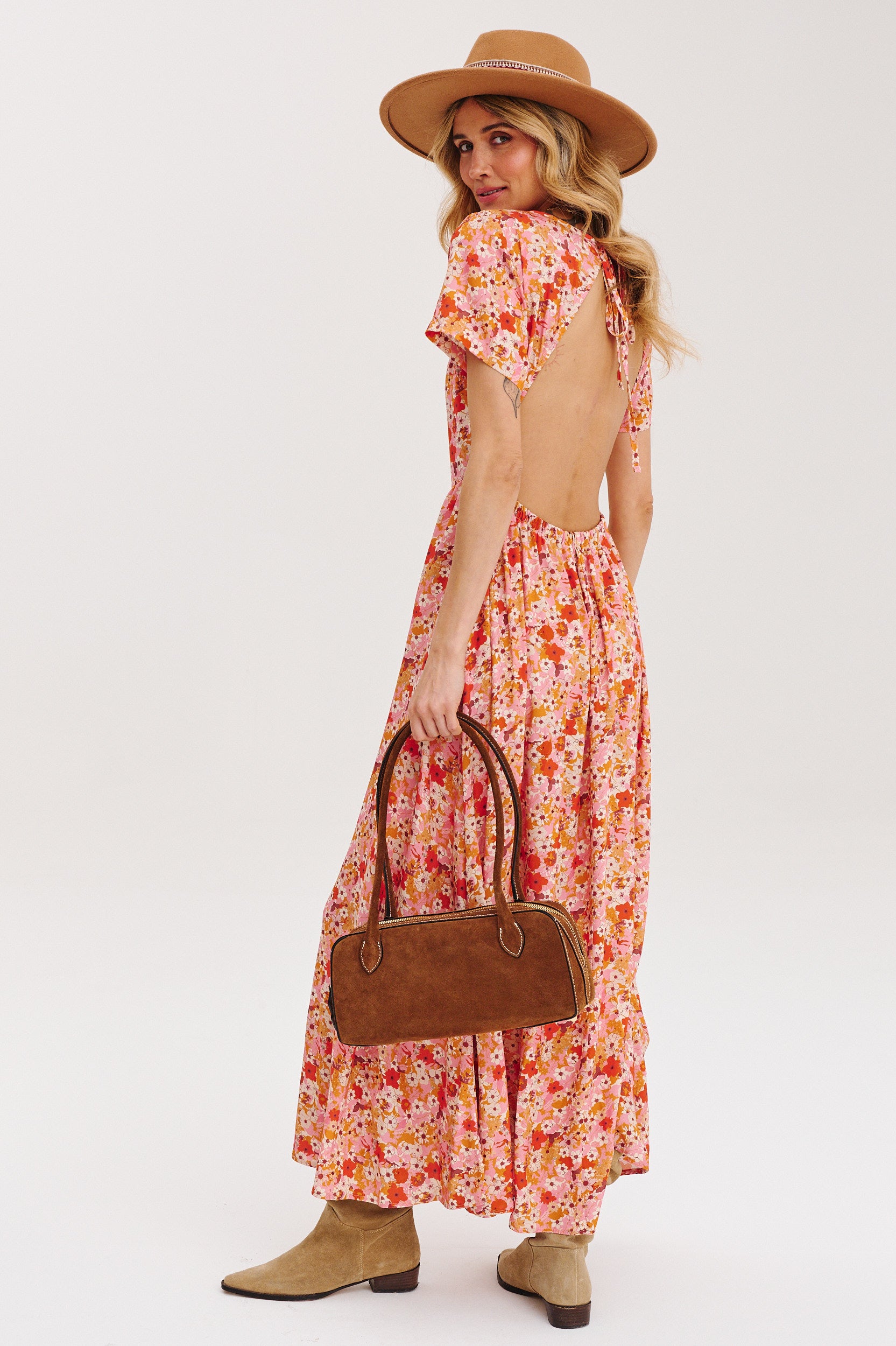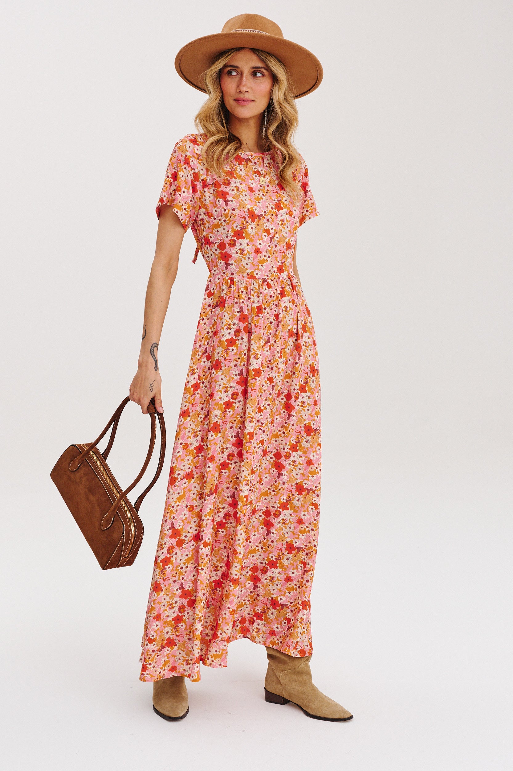 Sukienka maxi z odkrytymi plecami Dakota to oda do ciepłych dni i beztroskich chwil. Jej print w jasne, drobne kwiaty przypomina o letnich łąkach skąpanych w słońcu, a przewiewna wiskoza zapewnia komfort nawet w największy upał. Delikatnie rozkloszowany dół i intrygujące plecy nadają sukience lekkości i kobiecego wdzięku.