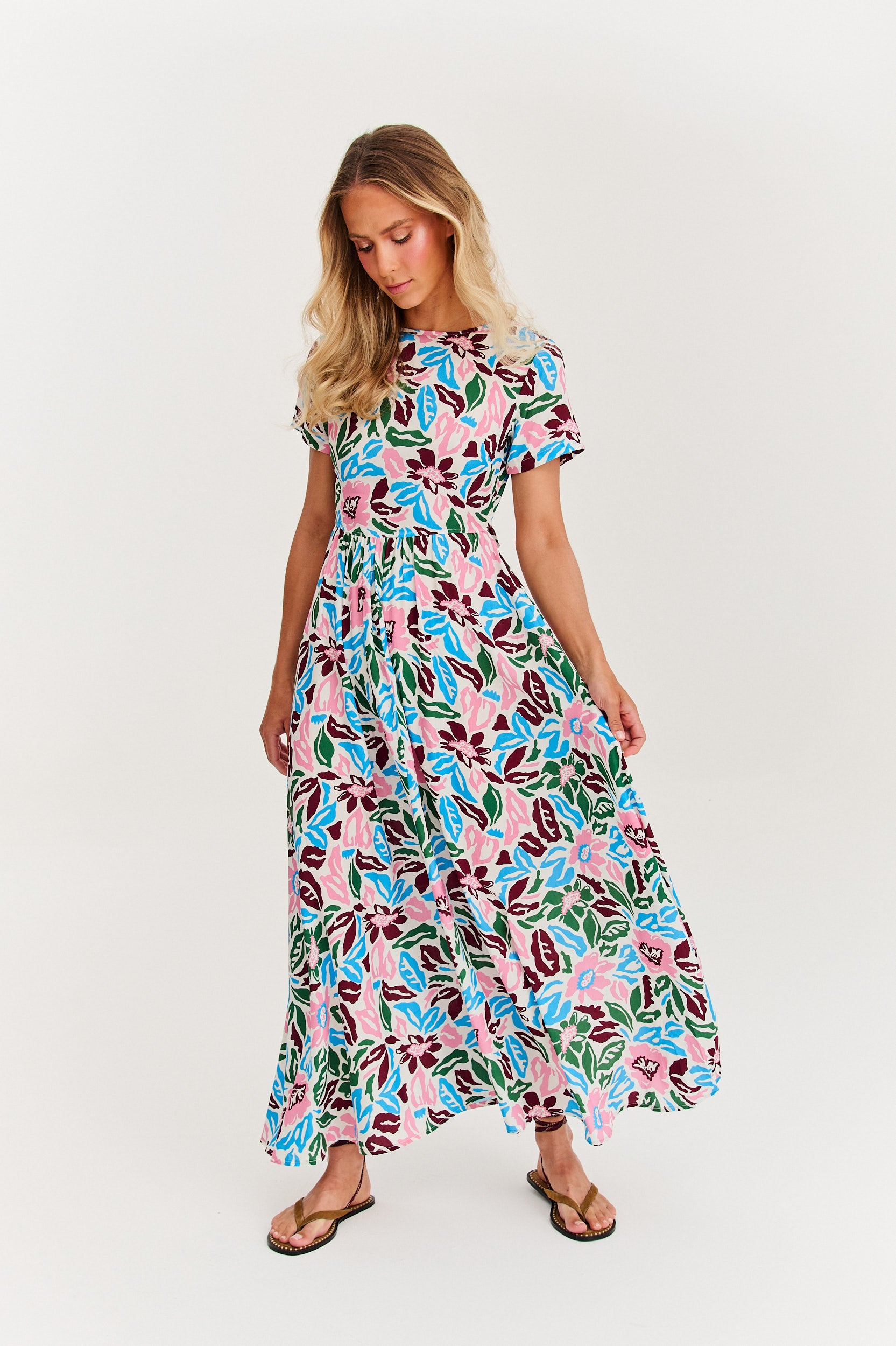 Sukienka maxi z odkrytymi plecami Dancing Petals to kwintesencja letniej lekkości i kobiecej zmysłowości. Jej przyciągający wzrok kwiatowy print w intensywnych kolorach ożywi każdą wakacyjną stylizację, a luźny krój zapewni swobodę noszenia nawet w największe upały. Model z krótkim rękawem, z subtelnym rozcięciem z tyłu i wiązaniem, łączy w sobie wygodę z efektem "wow".