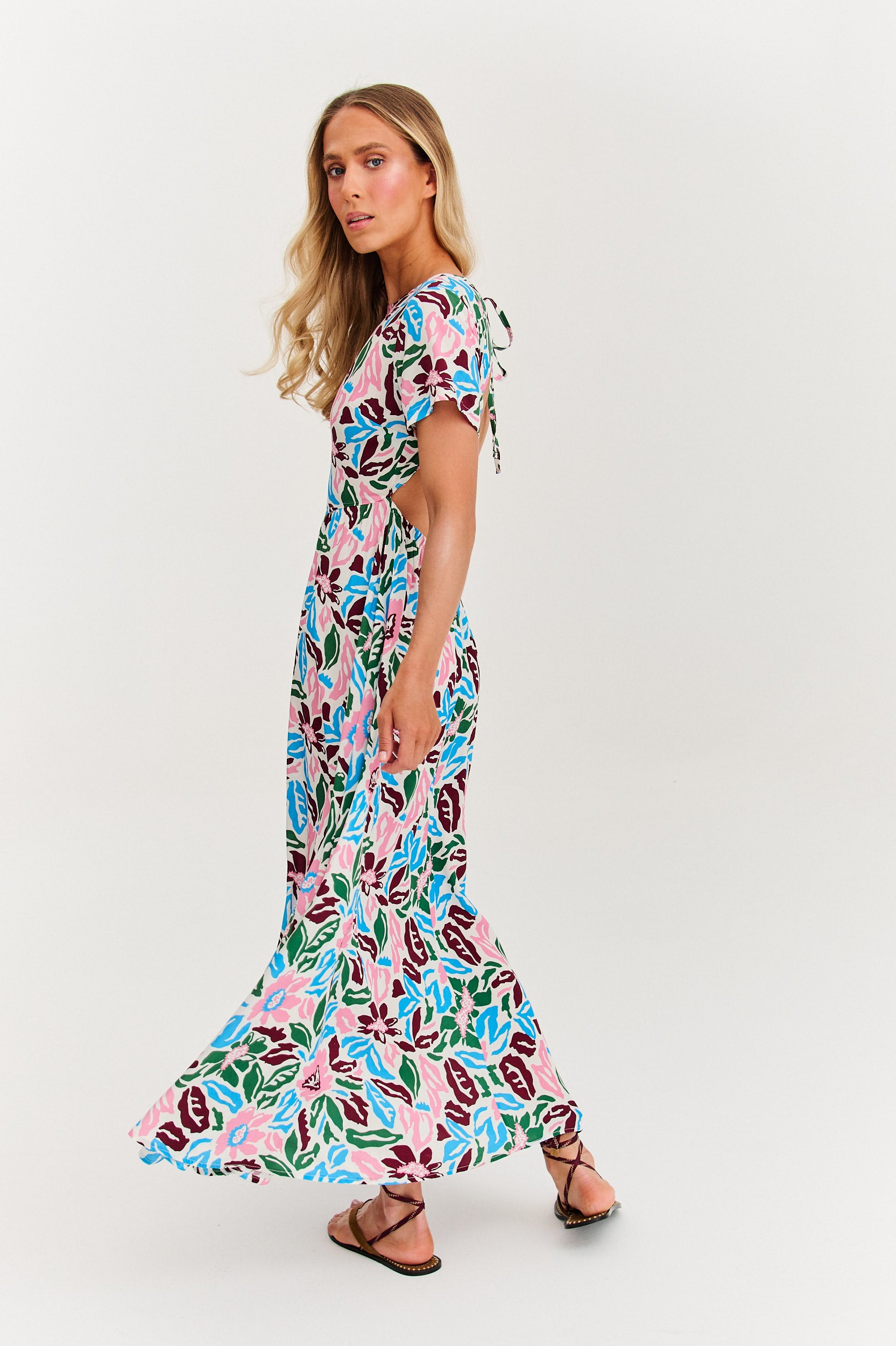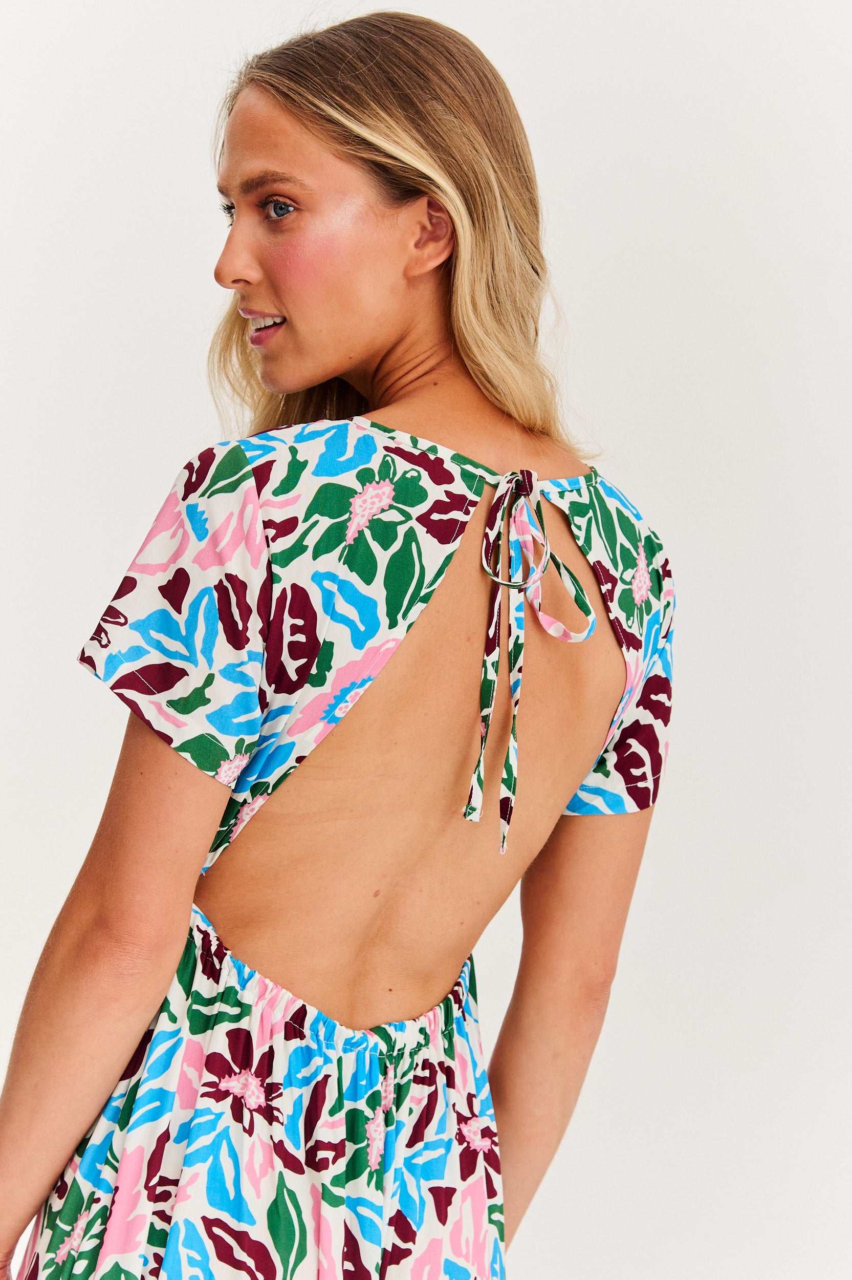 Sukienka maxi z odkrytymi plecami Dancing Petals to kwintesencja letniej lekkości i kobiecej zmysłowości. Jej przyciągający wzrok kwiatowy print w intensywnych kolorach ożywi każdą wakacyjną stylizację, a luźny krój zapewni swobodę noszenia nawet w największe upały. Model z krótkim rękawem, z subtelnym rozcięciem z tyłu i wiązaniem, łączy w sobie wygodę z efektem "wow".