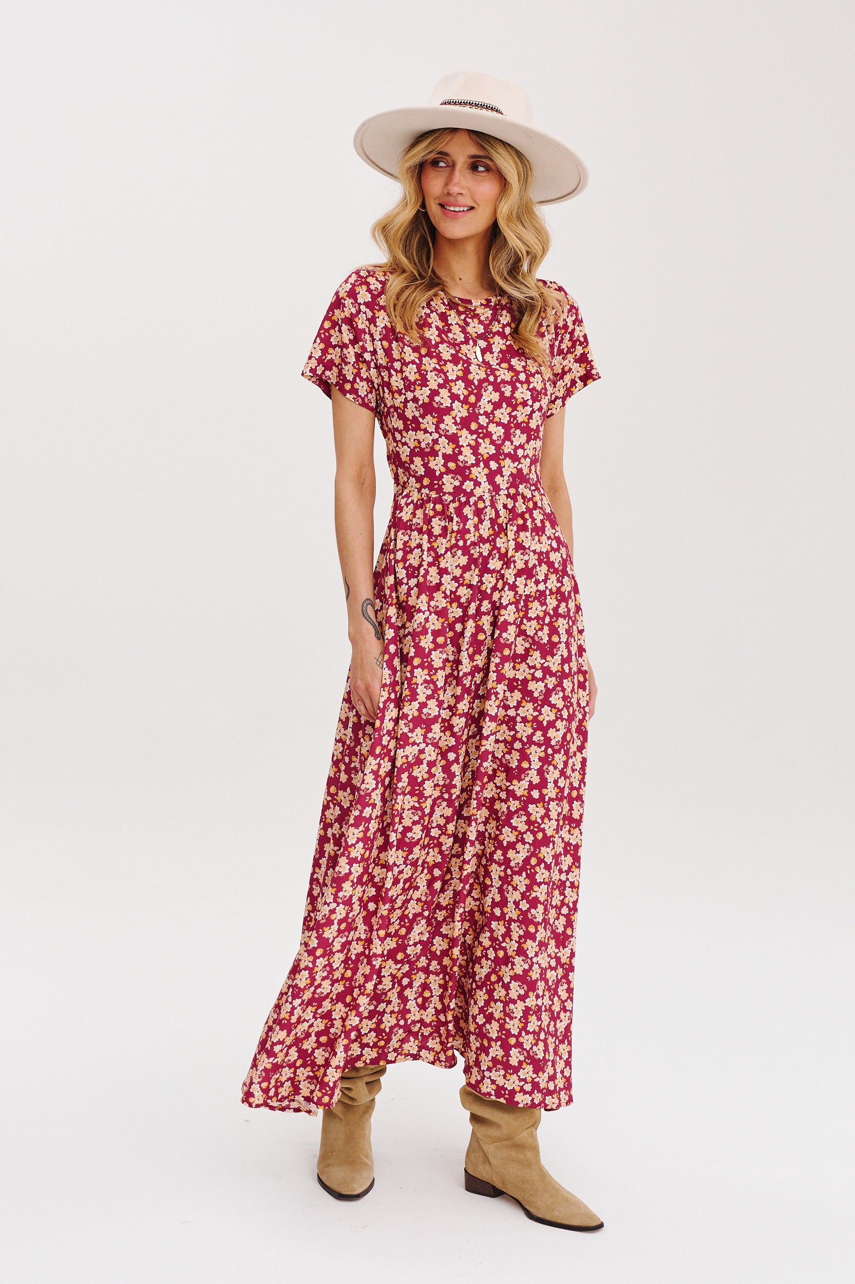 Sukienka maxi z odkrytymi plecami Mariposa to kobiecy ukłon w stronę romantycznych klimatów i boho wrażliwości. Delikatny wzór w drobne kwiaty, ciepły odcień tła i miękka, matowa wiskoza tworzą duet idealny na wiosenno-letnie okazje.