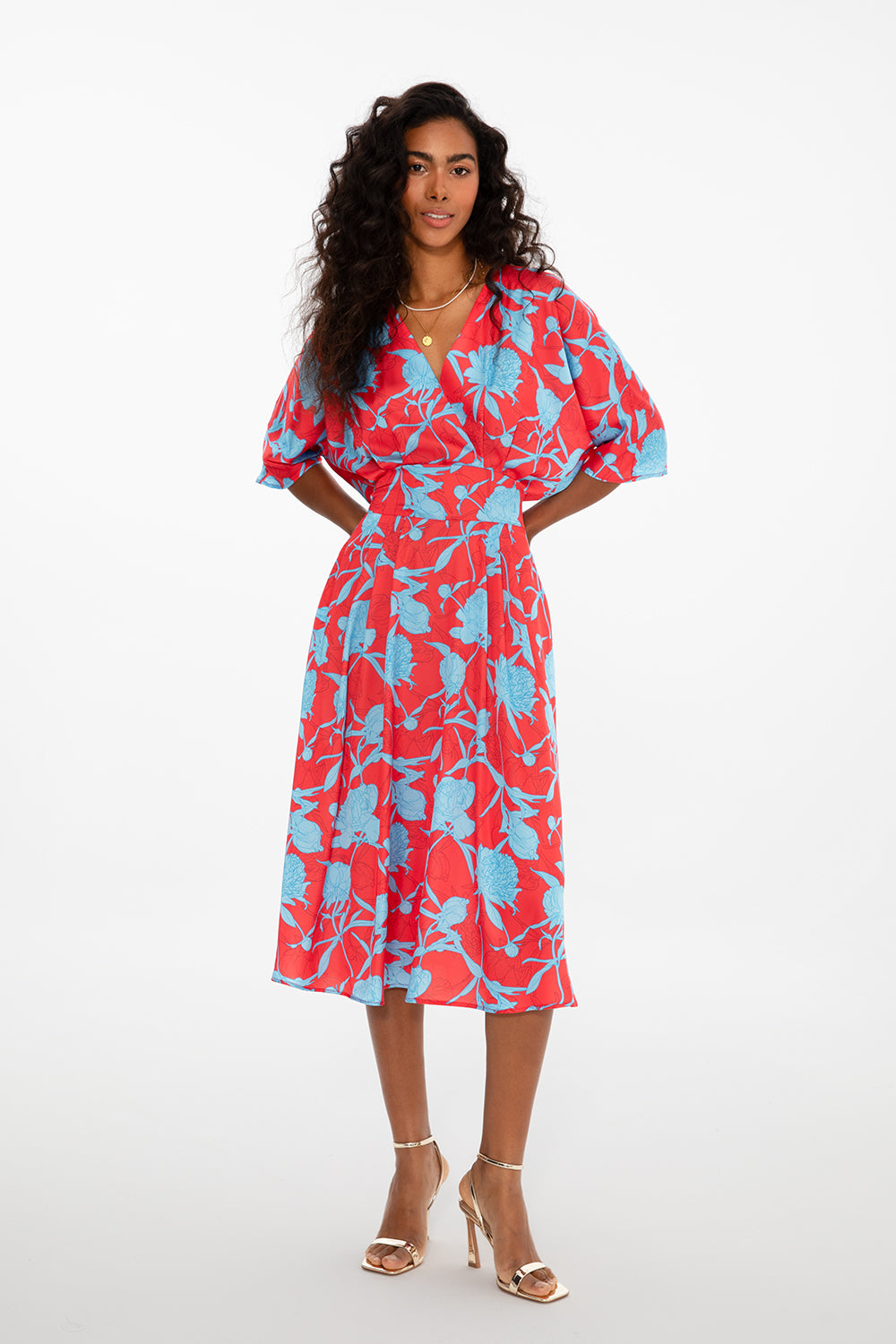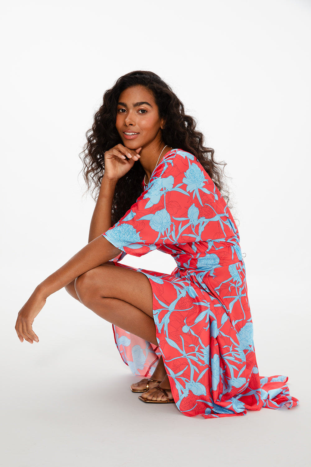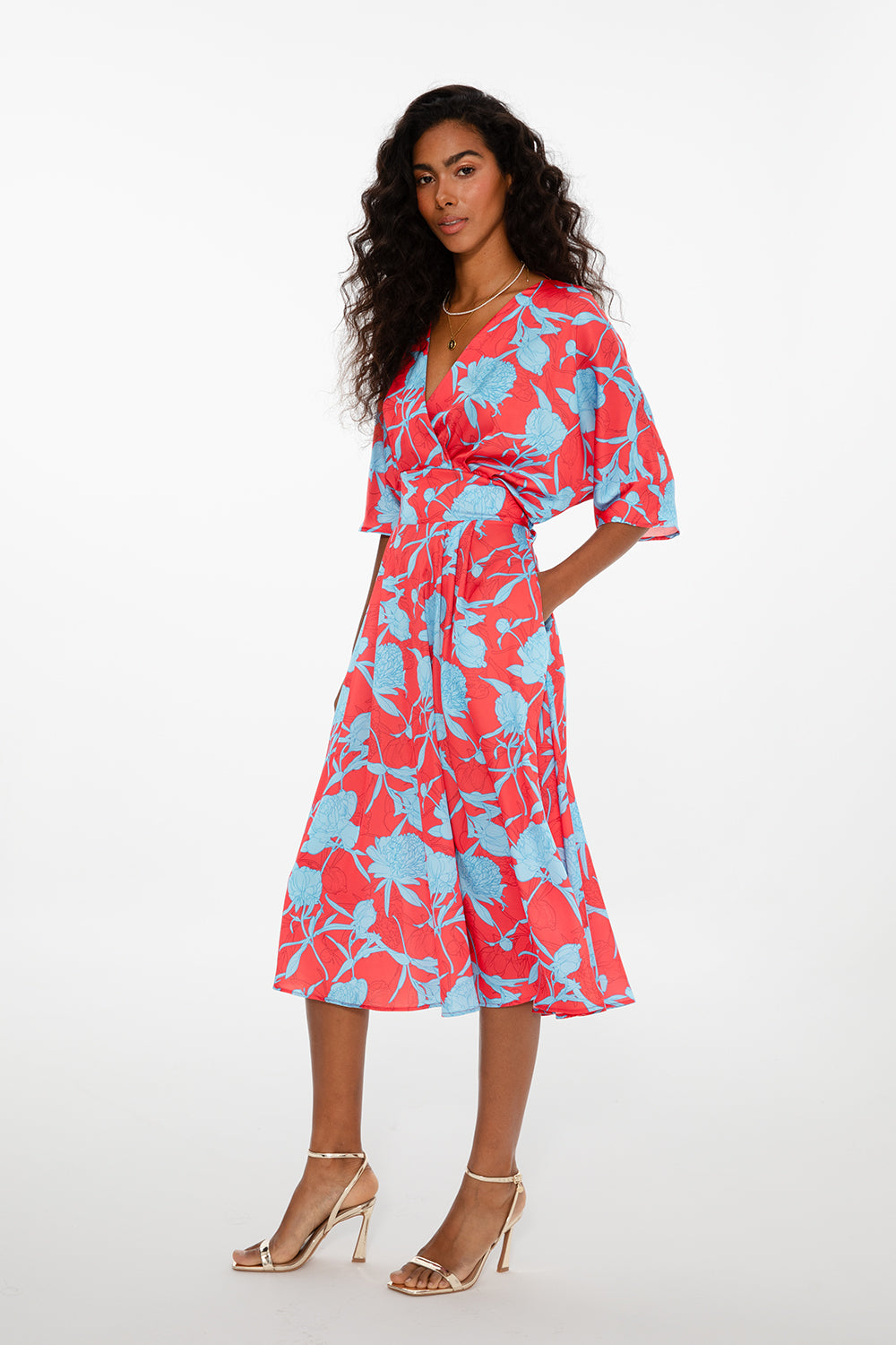 Pełna pasji, kobiecości i włoskiego temperamentu – sukienka midi Amore Mio to propozycja, której nie sposób przeoczyć. Intensywnie czerwony odcień tła i kontrastowe błękitne kwiaty tworzą duet, który przyciąga spojrzenia i rozpala wyobraźnię. Kopertowy dekolt, szerokie rękawy i lekko rozkloszowany dół nadają sylwetce płynności i romantycznego ruchu.