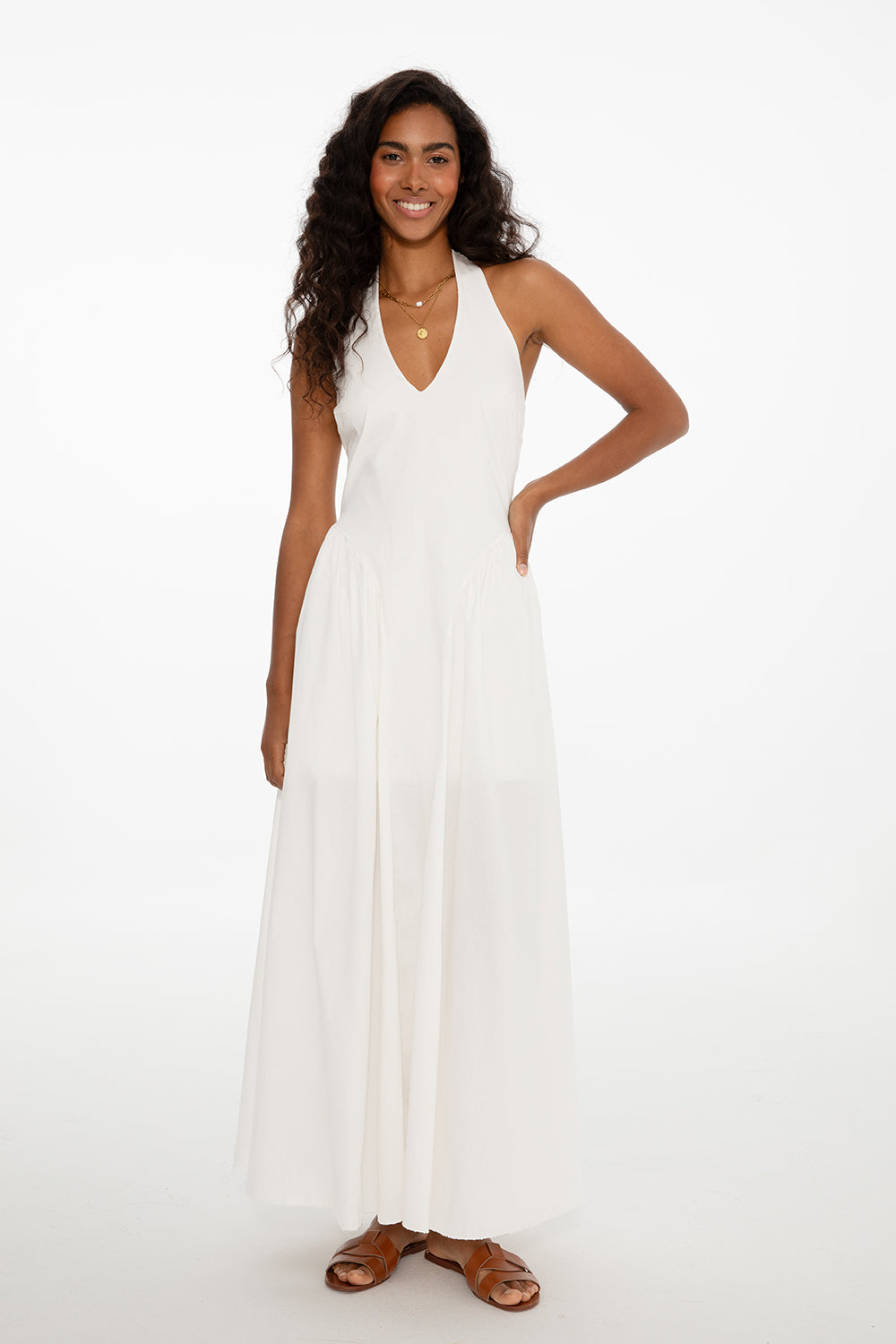 Sukienka midi Blanca Breeze to esencja lekkości i kobiecego uroku zamknięta w klasycznej bieli. Głęboki dekolt halter, wiązany na szyi, eksponuje ramiona i plecy, a rozszerzany dół delikatnie unosi się przy każdym ruchu, przywołując na myśl letnią bryzę i beztroskie chwile.