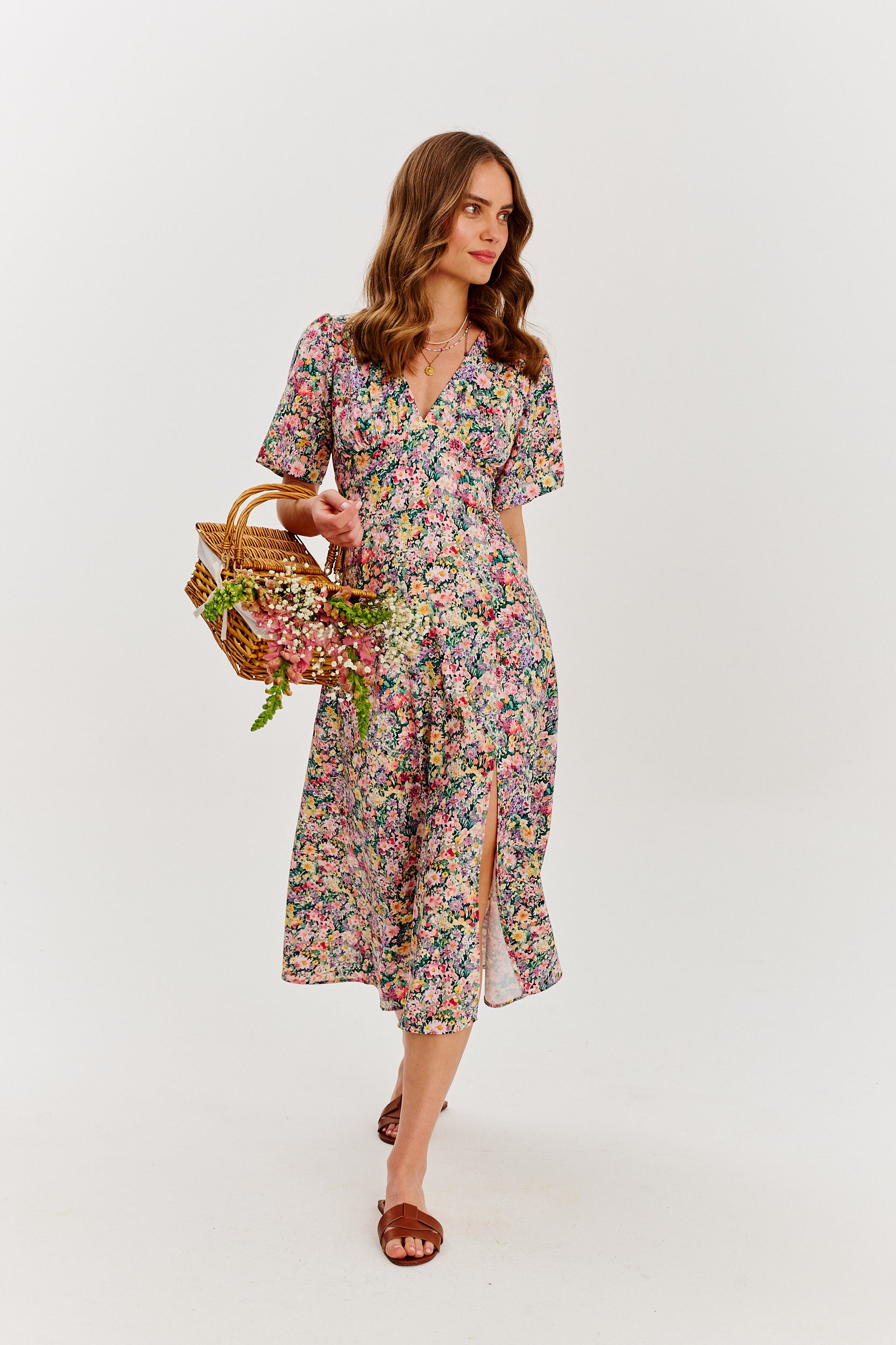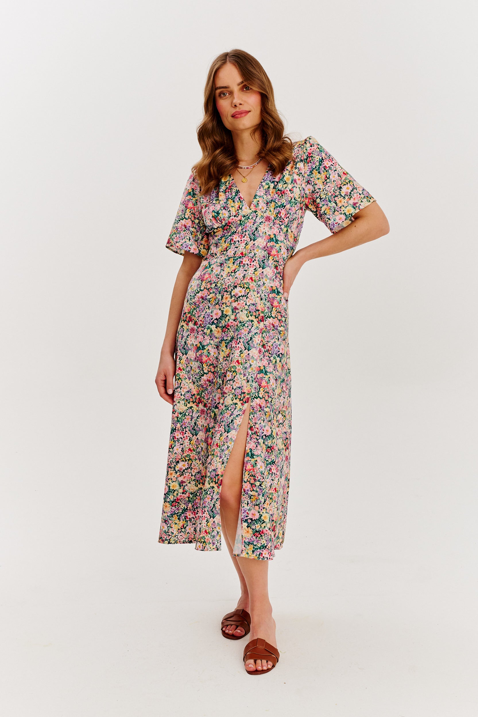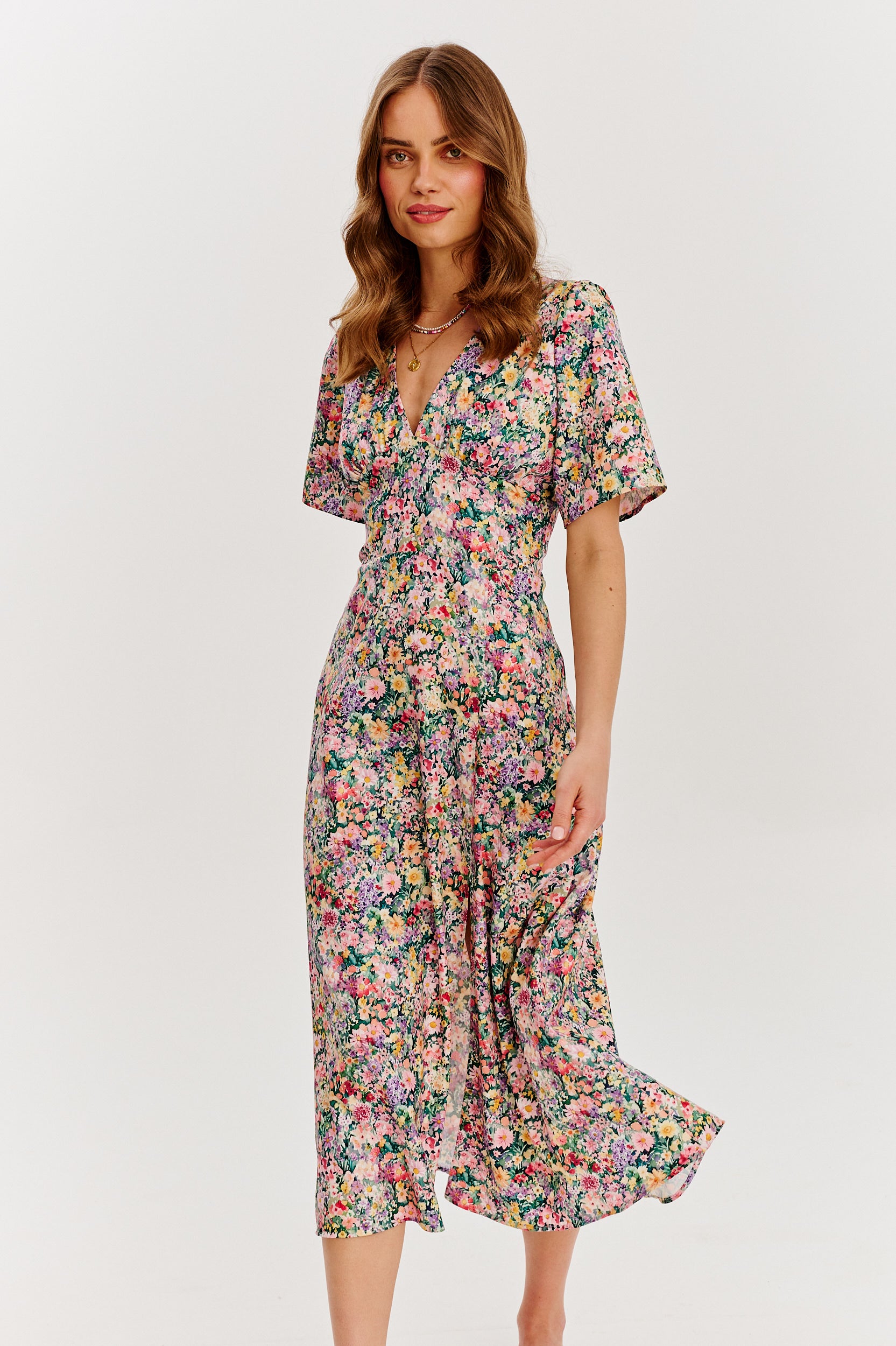 Powitaj wiosnę w sukience midi Bloom Therapy, która działa jak naturalna terapia. Bloom Therapy otula Cię morzem drobnych, barwnych kwiatów, tworząc efekt lekkości, radości i harmonii. Ten model zachwyca dopasowaną górą z dekoltem w literę V i krótkimi rękawkami, a rozkloszowany dół płynnie podąża za każdym Twoim ruchem.