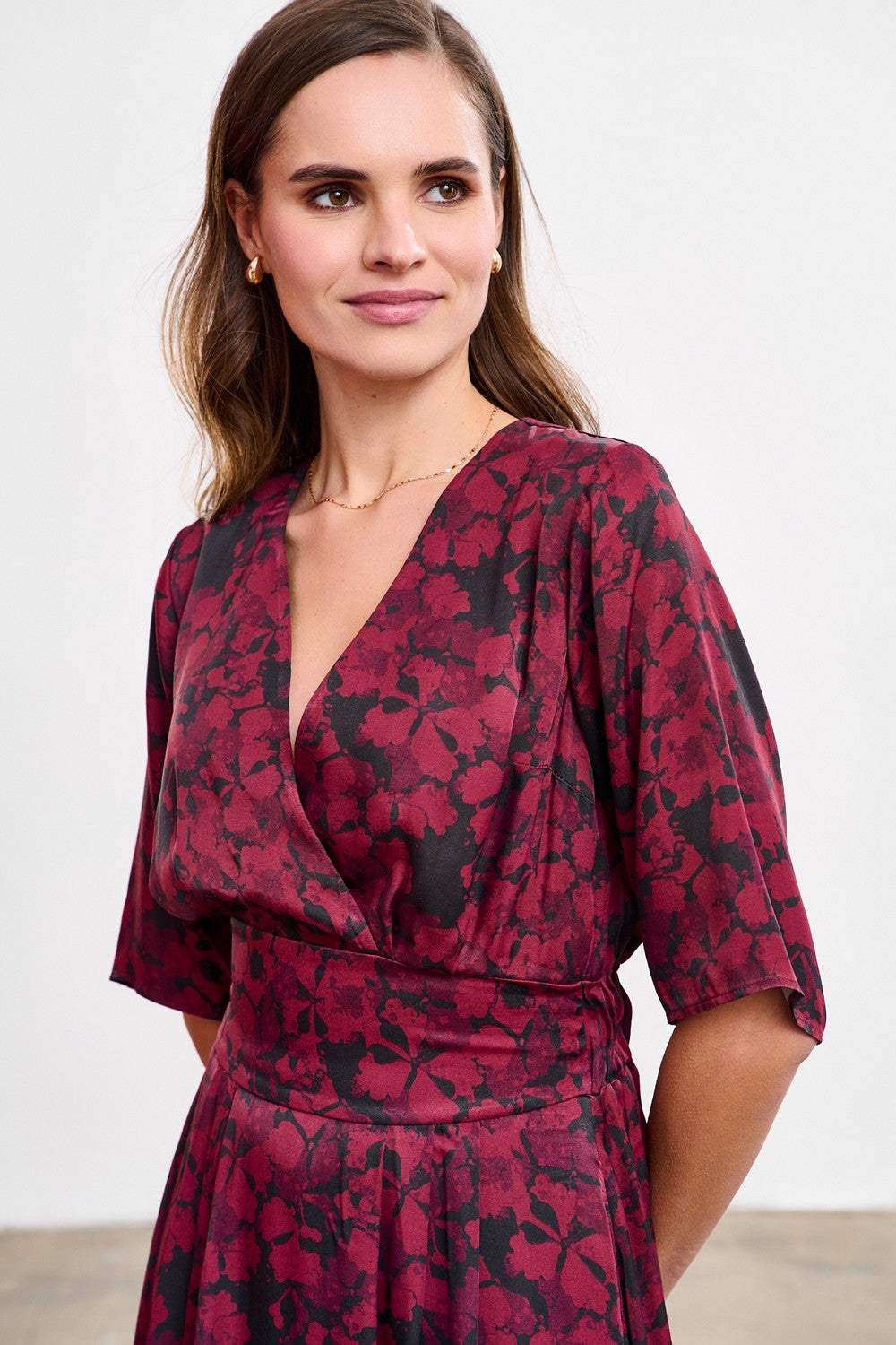 Sukienka midi Cranberry Spark łączy w sobie wyrazistość z klasyczną formą. Kopertowy dekolt pięknie eksponuje szyję, a wiązanie w pasie pozwala na idealne dopasowanie do figury. Wykonana z wiskozy, jest przewiewna i przyjemna dla ciała, a ciemny, kwiatowo-abstrakcyjny wzór dodaje jej tajemniczego charakteru.
