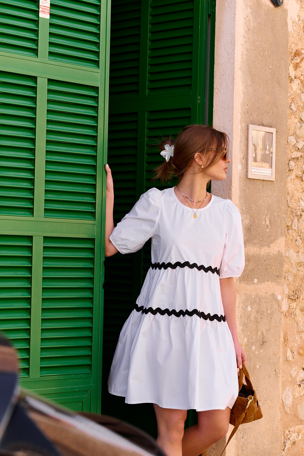 Sukienka midi Dolce Bianca to ukłon w stronę ponadczasowego fasonu baby doll. Krój z odcięciem w talii i lekkim rozkloszowaniem tworzy idealną sukienkę, która sprawdzi się zarówno na codzienne wyjścia, jak i wyjątkowe okazje. Bufiaste rękawy dodają jej dziewczęcego wdzięku, a kontrastowe wstawki przyciągają wzrok i nadają charakteru.