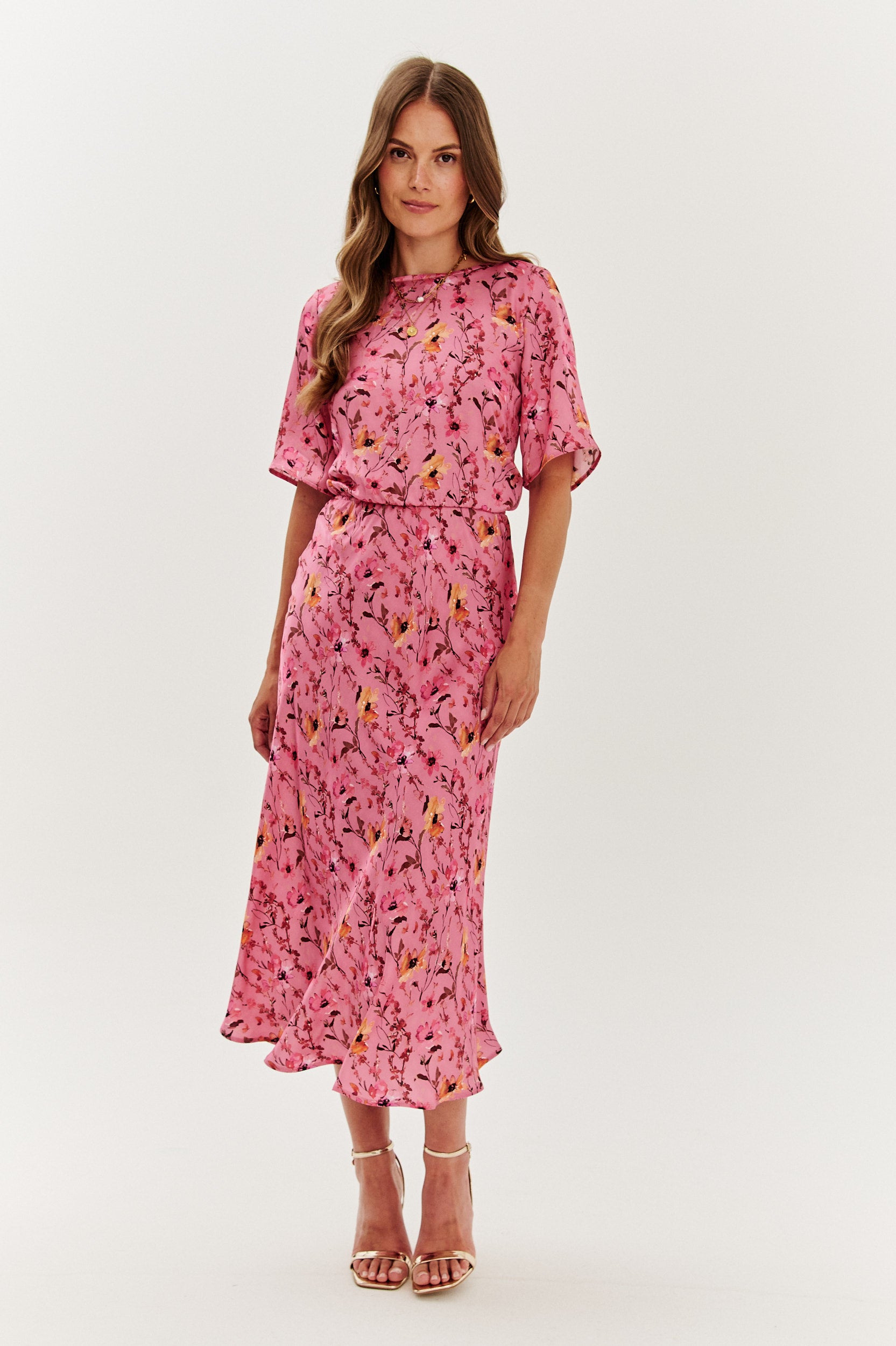 Sukienka midi dwustronna Bellissima to model, który daje Ci dwa oblicza kobiecości – w jednej sukience. Możesz ją nosić z przodem gładkim i klasycznym albo odwrócić i postawić na efektowny węzeł z głębokim dekoltem. Print w subtelne kwiaty podkreśla letni klimat, a lekka tkanina z wiskozy zapewnia komfort nawet w upalne dni.