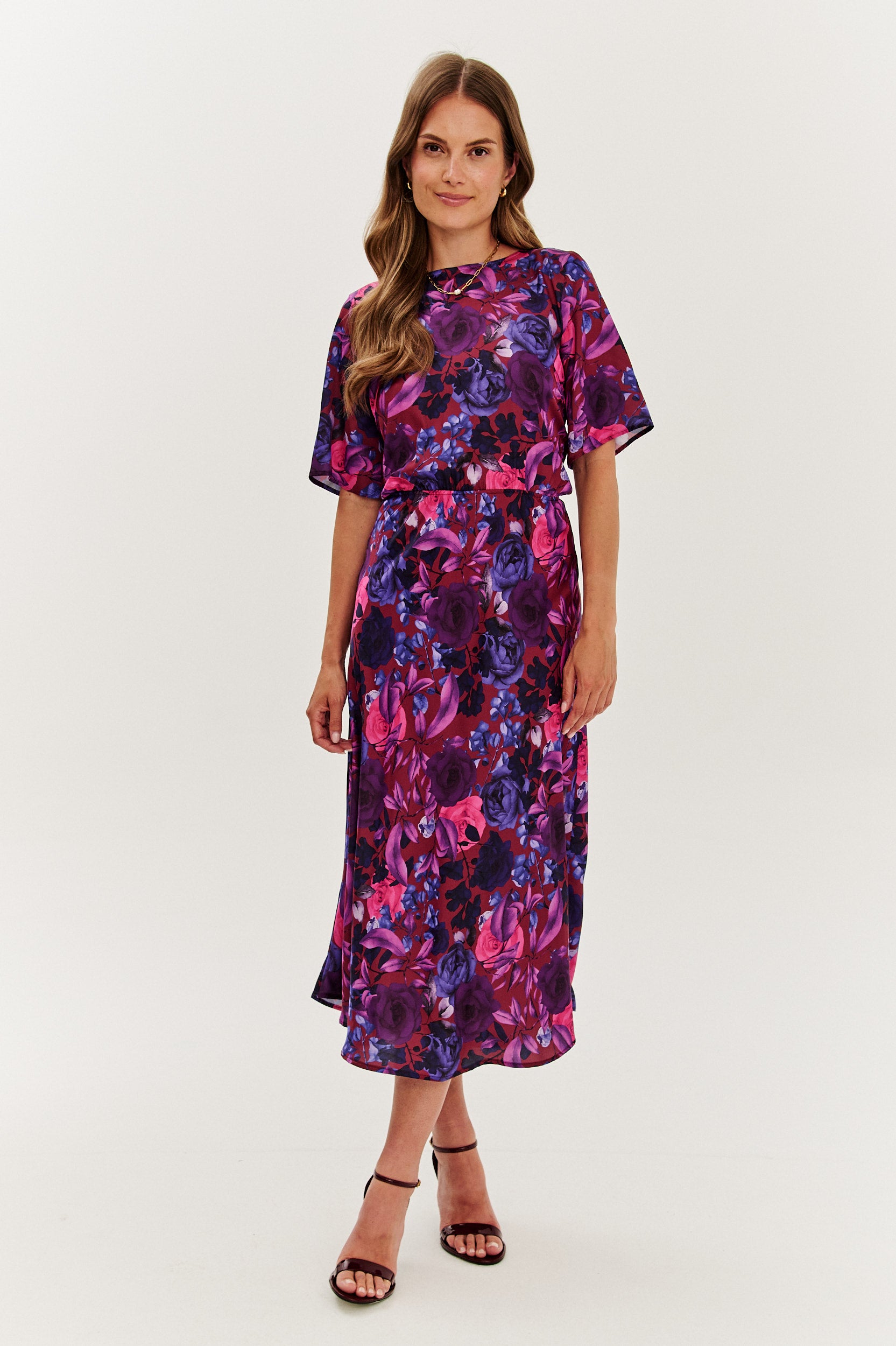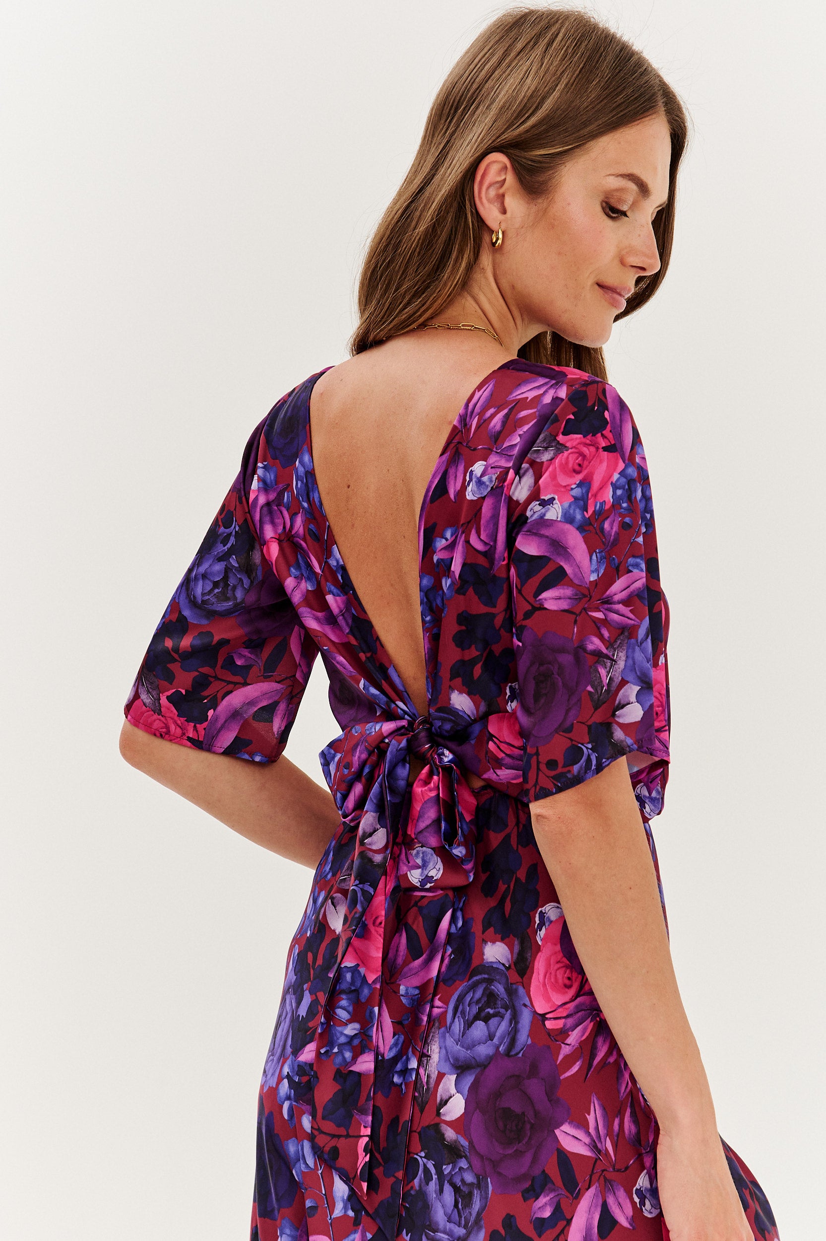 Sukienka midi dwustronna Rosabella to idealny balans między elegancją a modowym pazurem. Głęboki, kwiatowy print w odcieniach fioletu, fuksji i granatu tworzy efekt wow, a satynowy materiał pięknie odbija światło. Jej największy atut? Możesz ją nosić na dwa sposoby – z dekoltem z przodu i ozdobnym wiązaniem albo bardziej klasycznie, z łagodnym wykończeniem pod szyję.