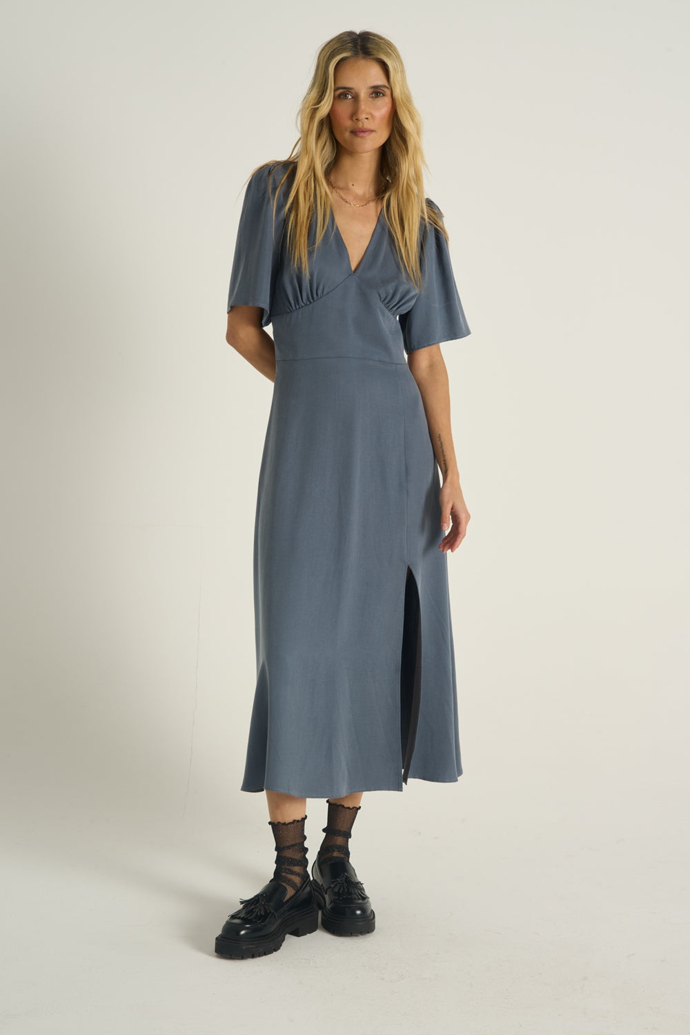 Sukienka midi Eternal Shadow udowadnia, że gładka tkanina nie musi być nudna. Wykonana w 100% z lyocellu, zachwyca miękkością i sposobem, w jaki układa się na ciele. Marszczenie pod biustem zapewnia idealne dopasowanie, a głęboki dekolt V dodaje całości charakteru.