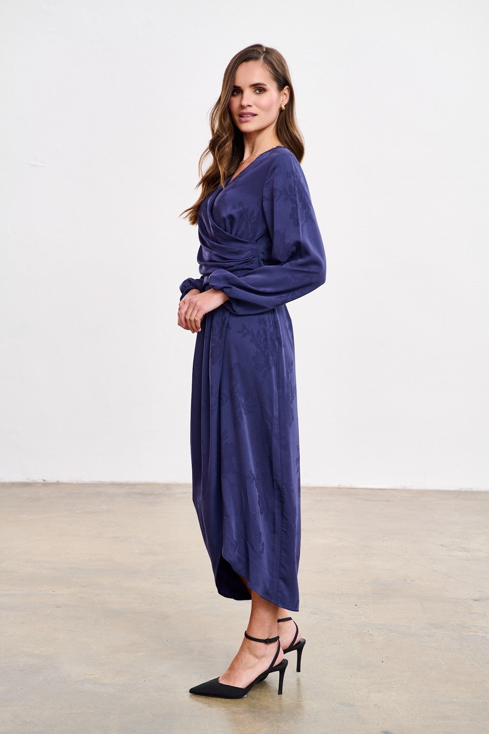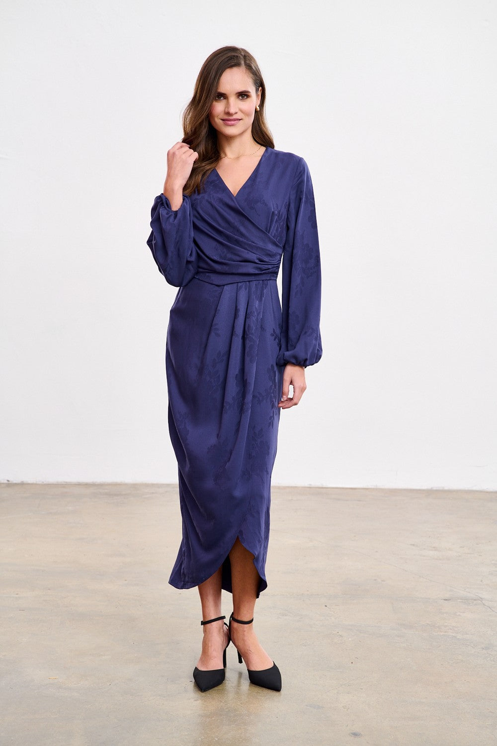 Sukienka midi Ethereal Whisper to połączenie klasyki z nowoczesną fakturą. Głęboki granat tkaniny żakardowej został ozdobiony delikatnym, tłoczonym motywem roślinnym, który mieni się w świetle. Kopertowa góra i dopasowany pas z drapowaniem modelują sylwetkę, nadając jej kształt klepsydry.