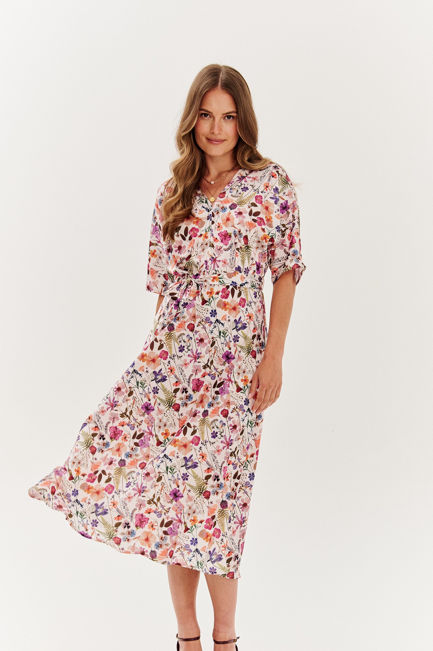 Sukienka midi Florence Kissed to kobieca sukienka w kwiaty, która zachwyca lekkością i kolorem. Jej zwiewny krój, długość midi i wiązany pasek w talii sprawiają, że pięknie podkreśla sylwetkę i zapewnia komfort przez cały dzień. Print w intensywne, letnie kwiaty dodaje energii, dzięki czemu sprawdzi się idealnie jako sukienka na wesele, sukienka na przyjęcie w ogrodzie czy po prostu – na co dzień, kiedy chcesz wyglądać wyjątkowo bez wysiłku.