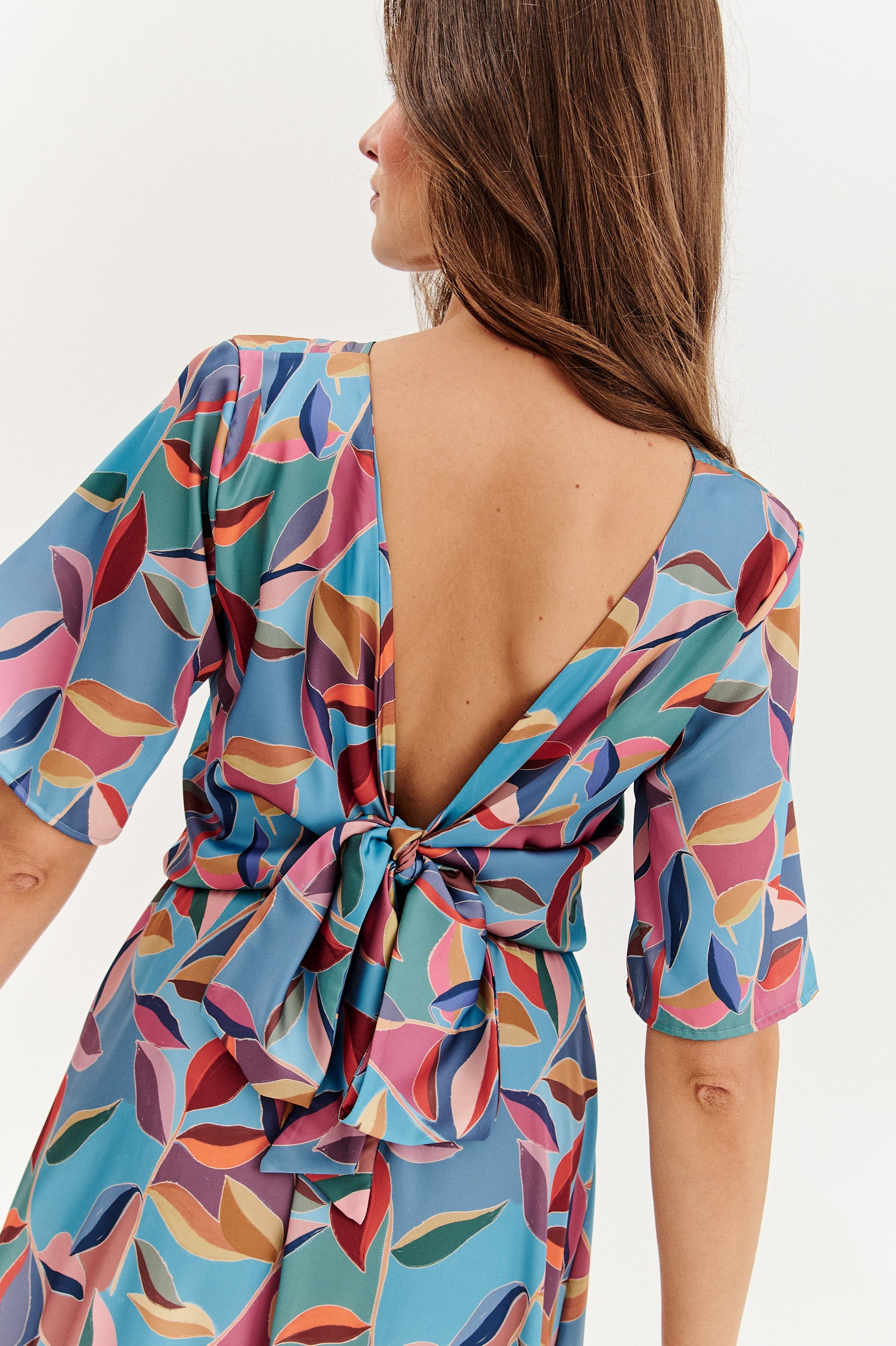Sukienka midi La Luz to wyjątkowy model, który zachwyca swoim fasonem i artystycznym wzorem. Kolorowy print z motywem liści w odcieniach błękitu, różu, pomarańczu i fioletu tworzy niepowtarzalną kompozycję, idealną na ciepłe dni.