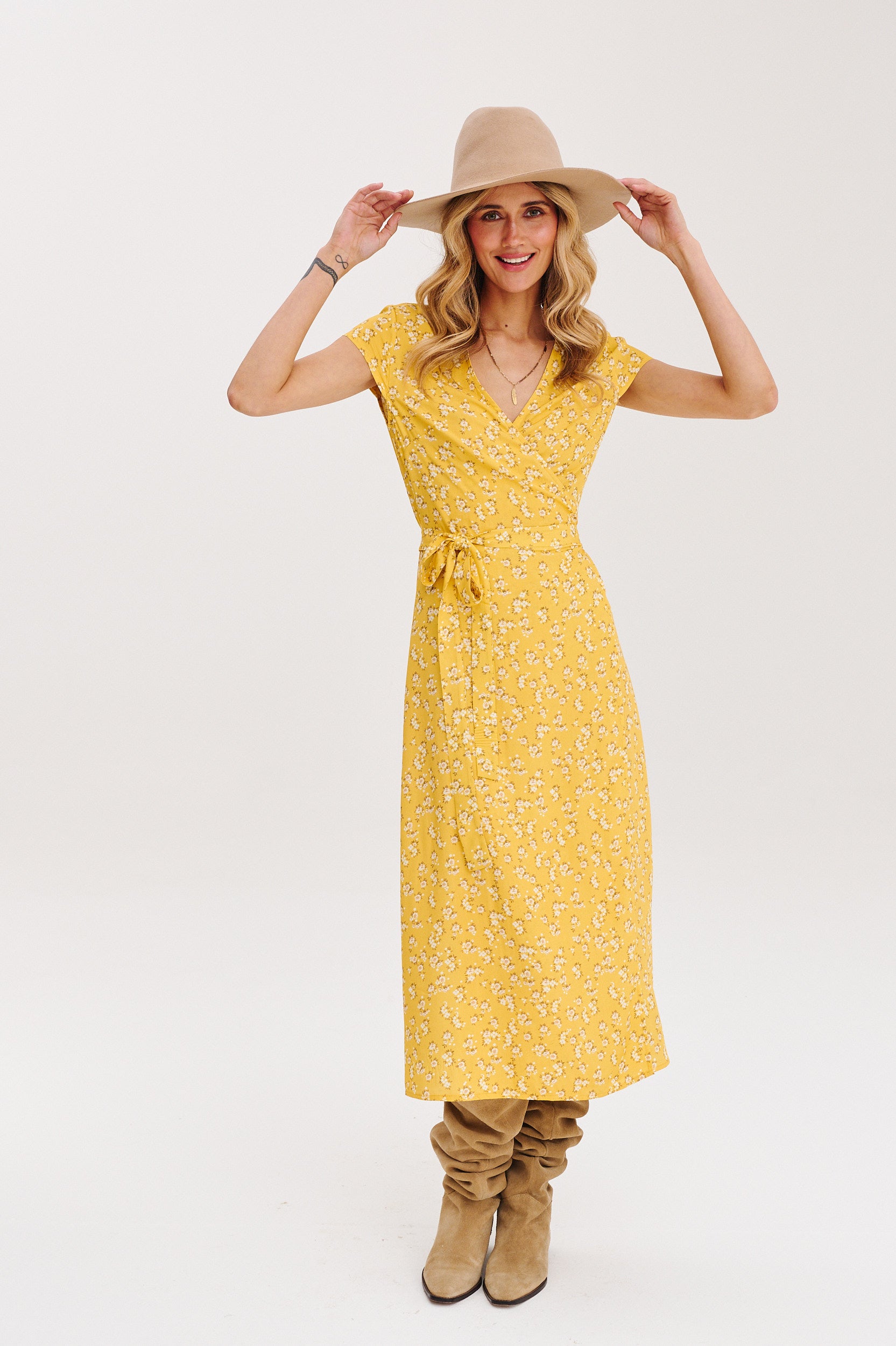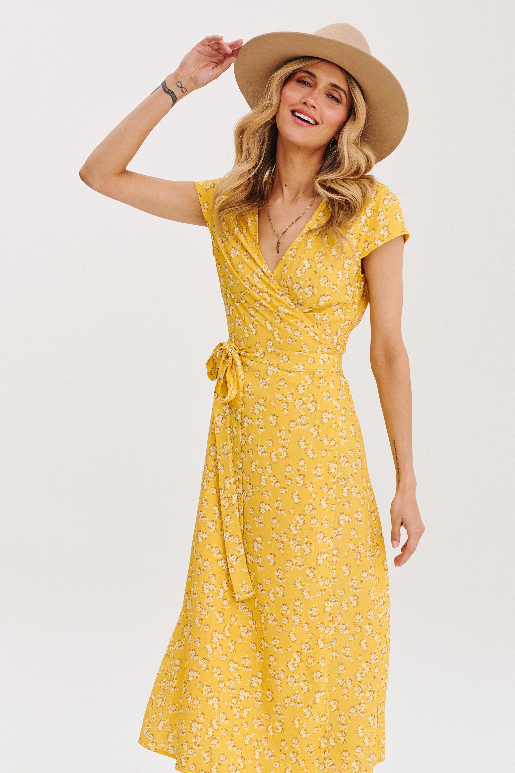 Sukienka midi Lemon Loretta to idealny wybór na ciepłe, słoneczne dni. Jej intensywny, cytrynowy kolor w połączeniu z delikatnym kwiatowym wzorem sprawia, że wyróżnisz się z tłumu z lekkością i wdziękiem. Kopertowy krój z wiązaniem w talii pięknie podkreśla sylwetkę, a krótki rękawek dodaje jej dziewczęcego uroku.