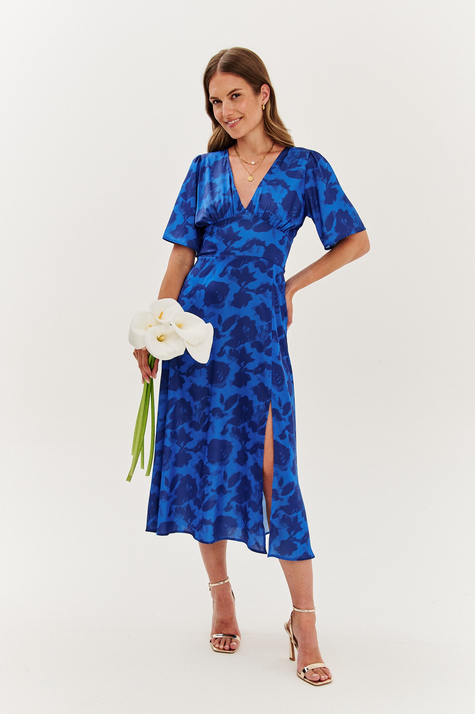Sukienka midi Lunablue to wyjątkowa propozycja dla kobiet, które szukają stylizacji łączącej wyrazistość koloru z subtelną formą. Fason w literę A, z pięknie układającym się dołem i krótkim rękawem, podkreśla talię, zapewniając jednocześnie wygodę i swobodę ruchu. Głęboki odcień niebieskiego z abstrakcyjnym nadrukiem dodaje całości oryginalnego charakteru i przyciąga wzrok.