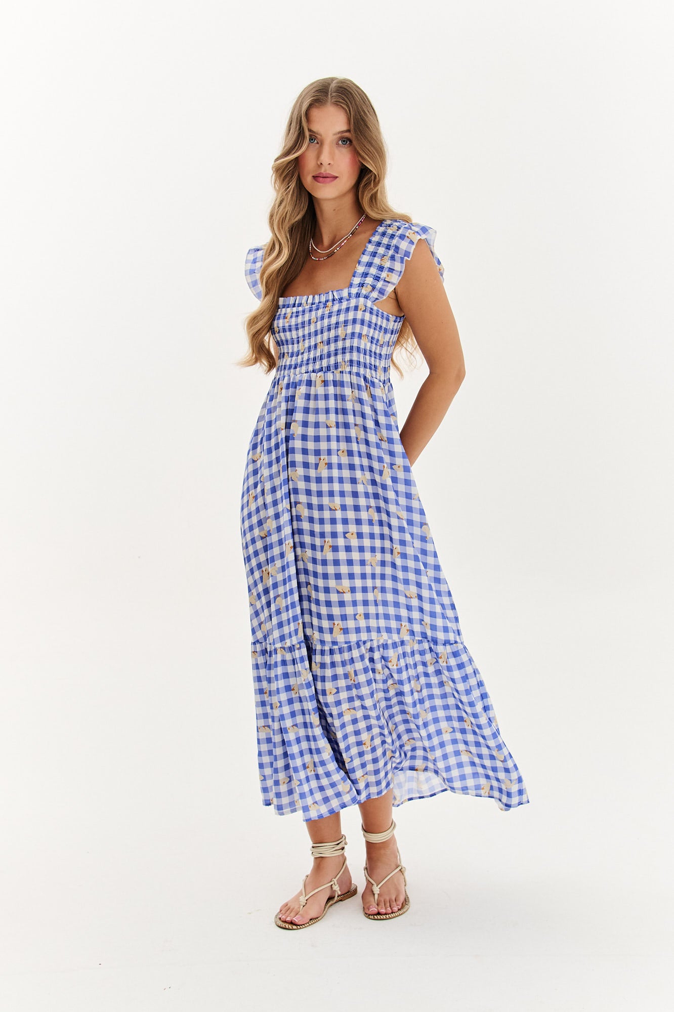 Sukienka midi Madame Goose to wakacyjny manifest uroku i wygody. Jej subtelny niebiesko-biały wzór w kratkę, uzupełniony nadrukiem uroczych gąsek, wprowadza w sielski nastrój letnich dni. Elastyczna góra z marszczeniem pięknie dopasowuje się do sylwetki, a długość midi i cienkie ramiączka sprawiają, że to idealna sukienka na piknik, spacer po plaży czy lunch w ogrodzie.