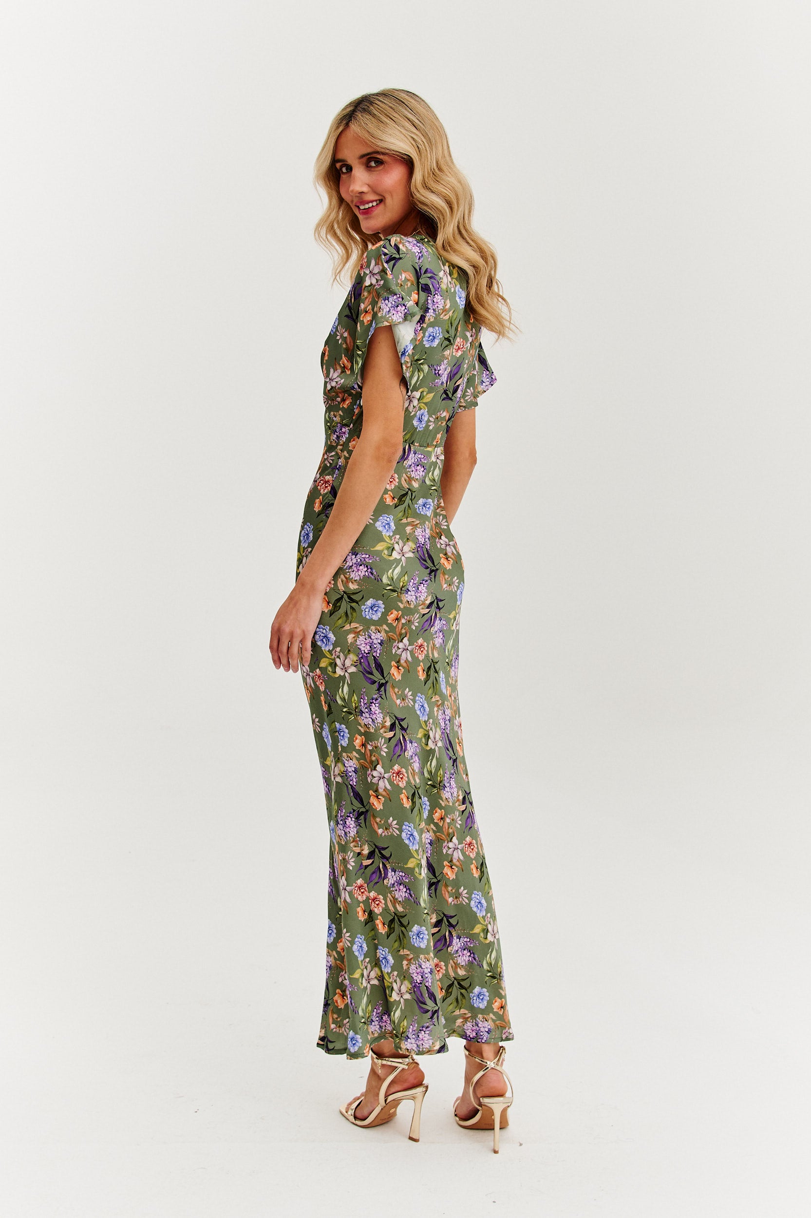 Sukienka midi Mirabella to hołd dla kobiecości w najpiękniejszym, kwiatowym wydaniu. Jej dopasowany krój podkreśla sylwetkę, a delikatny dekolt i zwiewne rękawy dodają romantyzmu i lekkości. Zielona baza z intensywnym florystycznym printem tworzy efektowną kompozycję idealną na letnie uroczystości i wyjątkowe wyjścia.