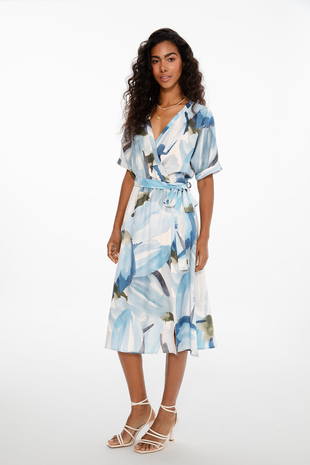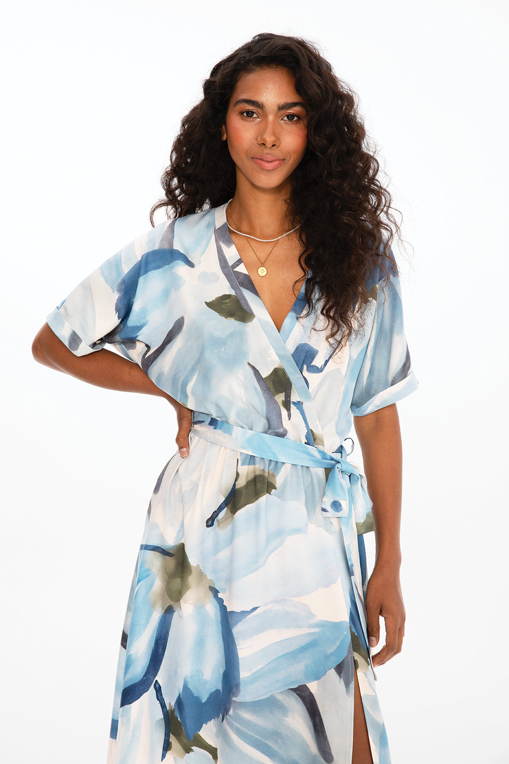 Sukienka midi Painted Skies to lekkość, która przyciąga spojrzenia. Akwarelowy print w odcieniach błękitu i delikatnego beżu sprawia, że model wygląda jak namalowany na jedwabiu. Zwiewna wiskoza, miękka w dotyku i pięknie pracująca w ruchu, nadaje sukience niepowtarzalnej elegancji. Luźny fason z paskiem do wiązania w talii i subtelnym rozcięciem z przodu to wygoda i efektowność w jednym.