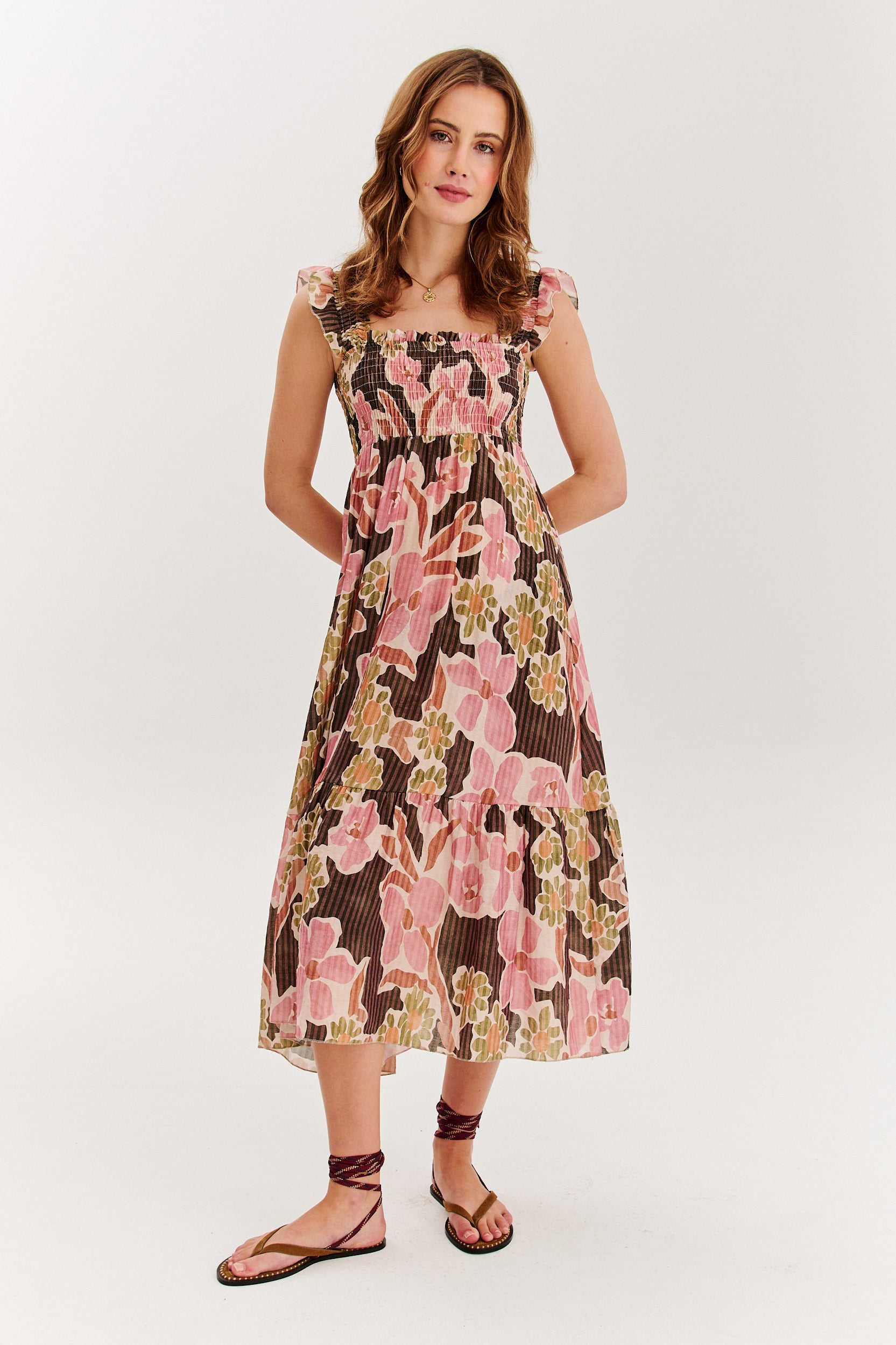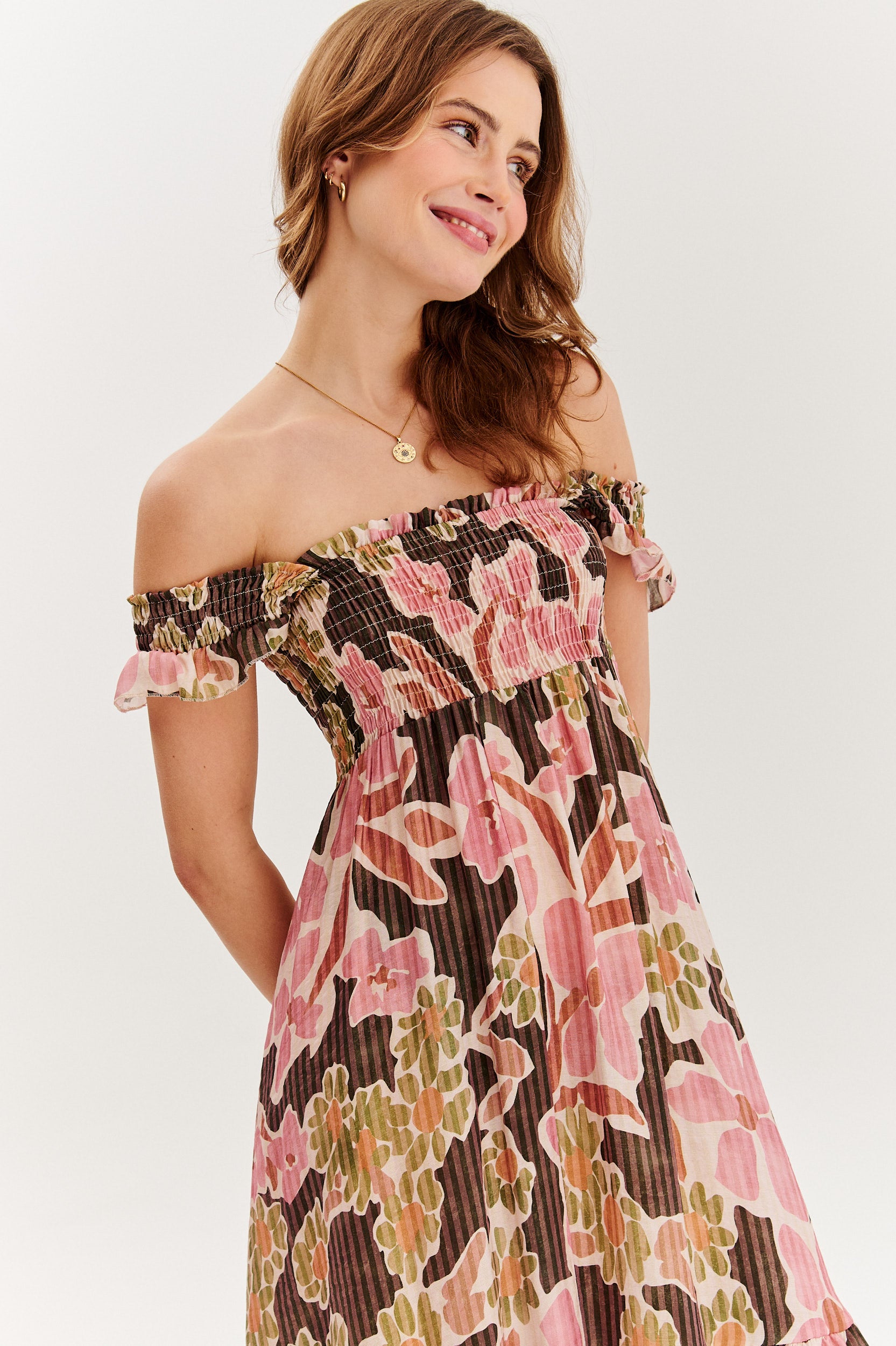 Sukienka midi Vintage Paloma to romantyczna odsłona lata – lekka, kwiecista i pełna dziewczęcego uroku. Delikatny print w odcieniach różu i oliwkowej zieleni przyciąga spojrzenia, a elastyczna, marszczona góra dopasowuje się do sylwetki, podkreślając dekolt i ramiona dzięki falbankowym ramiączkom.