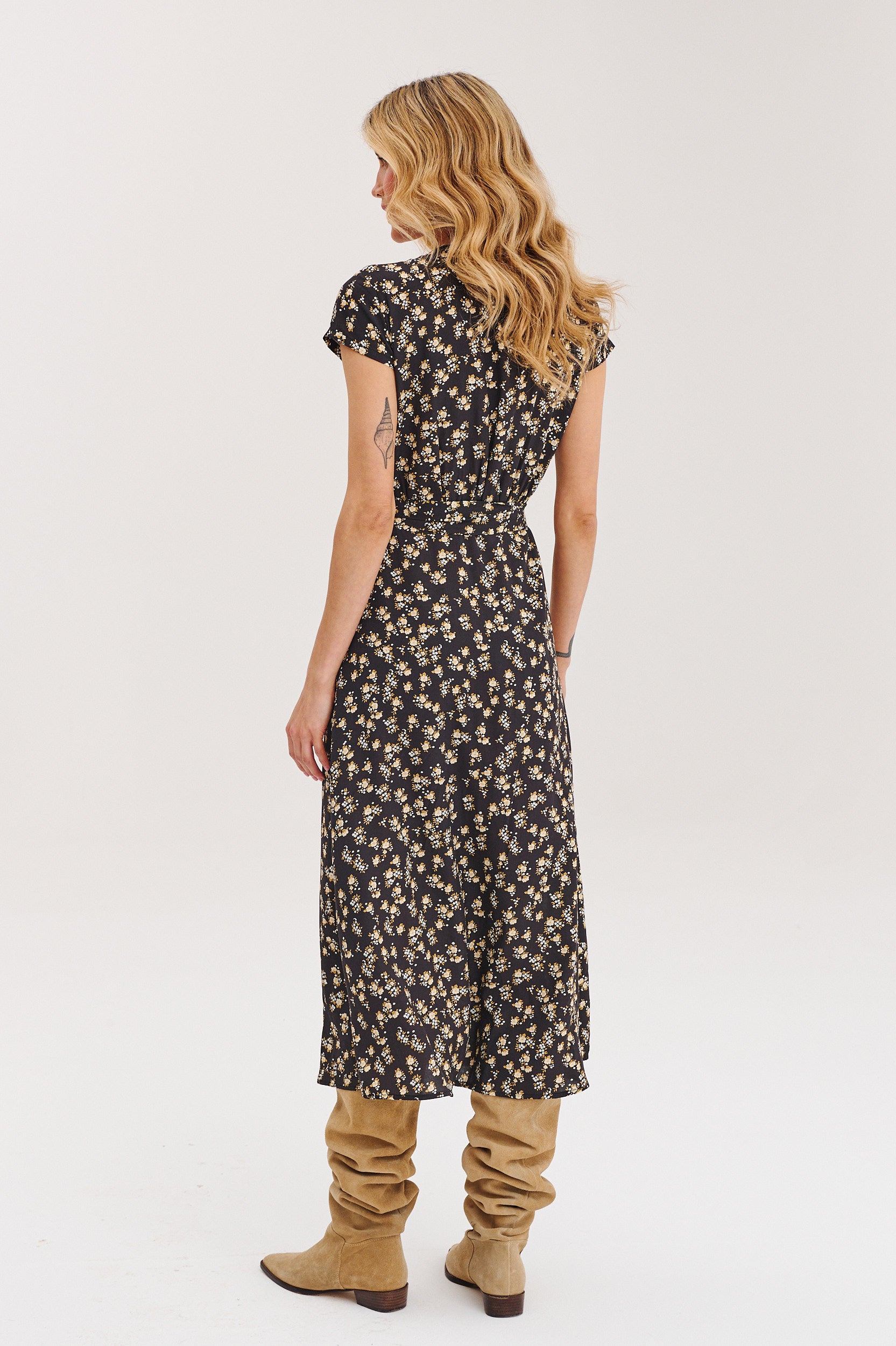 Wykonana z matowej wiskozy, sukienka jest przyjemna w noszeniu i przewiewna – idealna na wiosenno-letni sezon. Print w drobne kwiatuszki na czarnym tle dodaje subtelności i naturalnego uroku. To model, po który sięgniesz wiele razy – za każdym razem z tą samą przyjemnością.