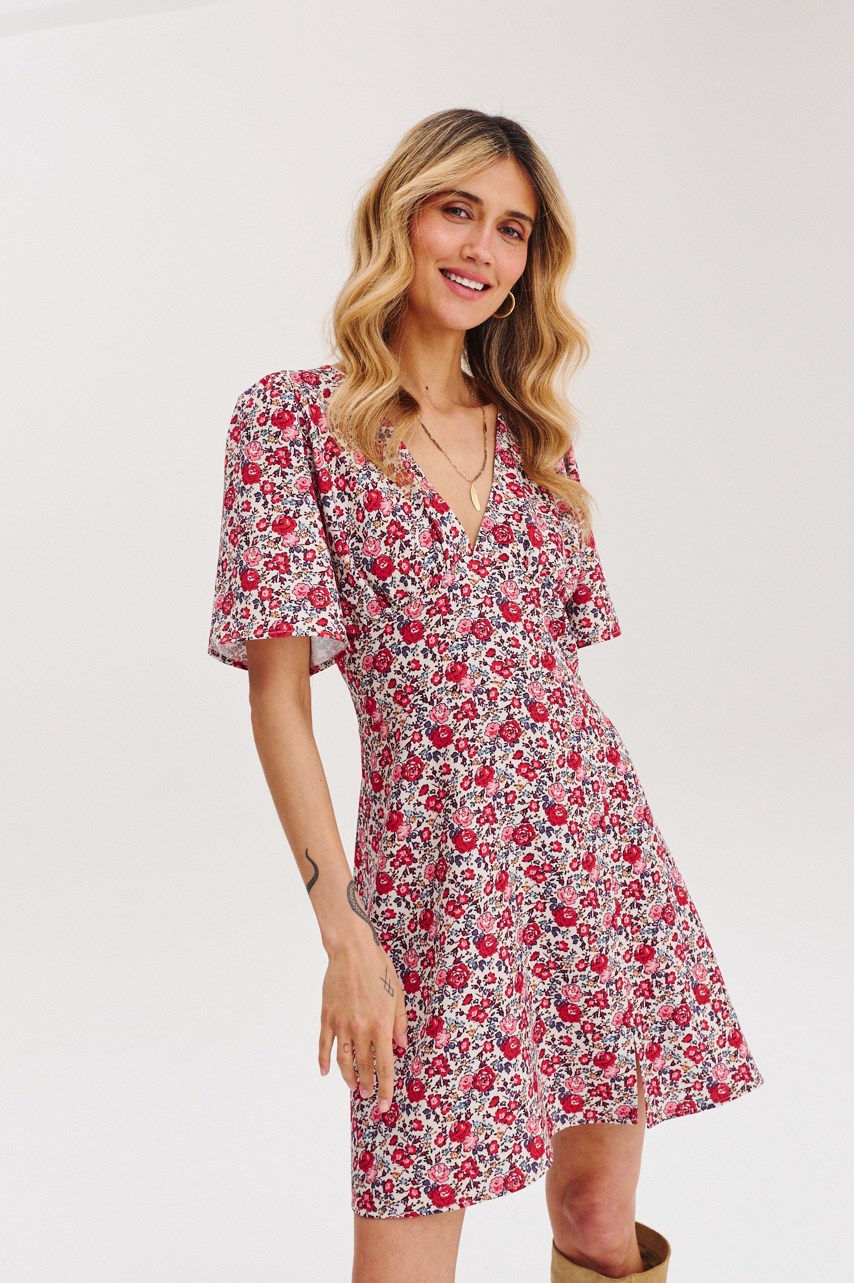 Sukienka mini Dakota Flower to idealna propozycja dla #naokogirls, które lubią kobiece, ale wygodne stylizacje z charakterem. Delikatny, kwiatowy print w intensywnych czerwieniach i fuksjach na białym tle nadaje całości lekkości i świeżości, a dopasowany krój z dekoltem w serek i lekko rozszerzanym dołem pięknie podkreśla sylwetkę.