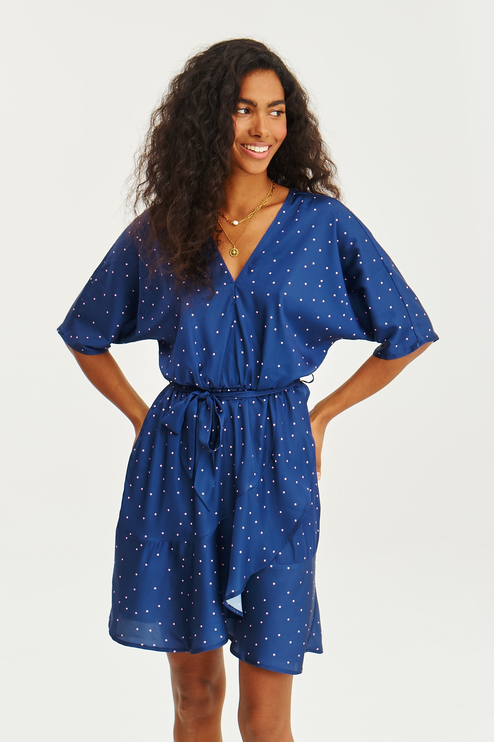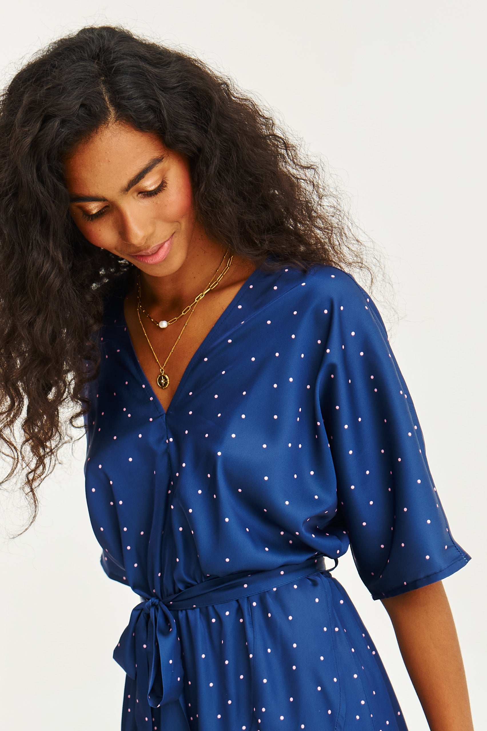 Sukienka mini Dolce Notte to klasyczna elegancja w letnim wydaniu – granatowe tło i drobne różowe, subtelne kropki przywodzą na myśl niebo pełne blasku. Kopertowy krój pięknie układa się na sylwetce, wiązanie w talii podkreśla figurę, a falbanka dodaje dziewczęcego uroku.