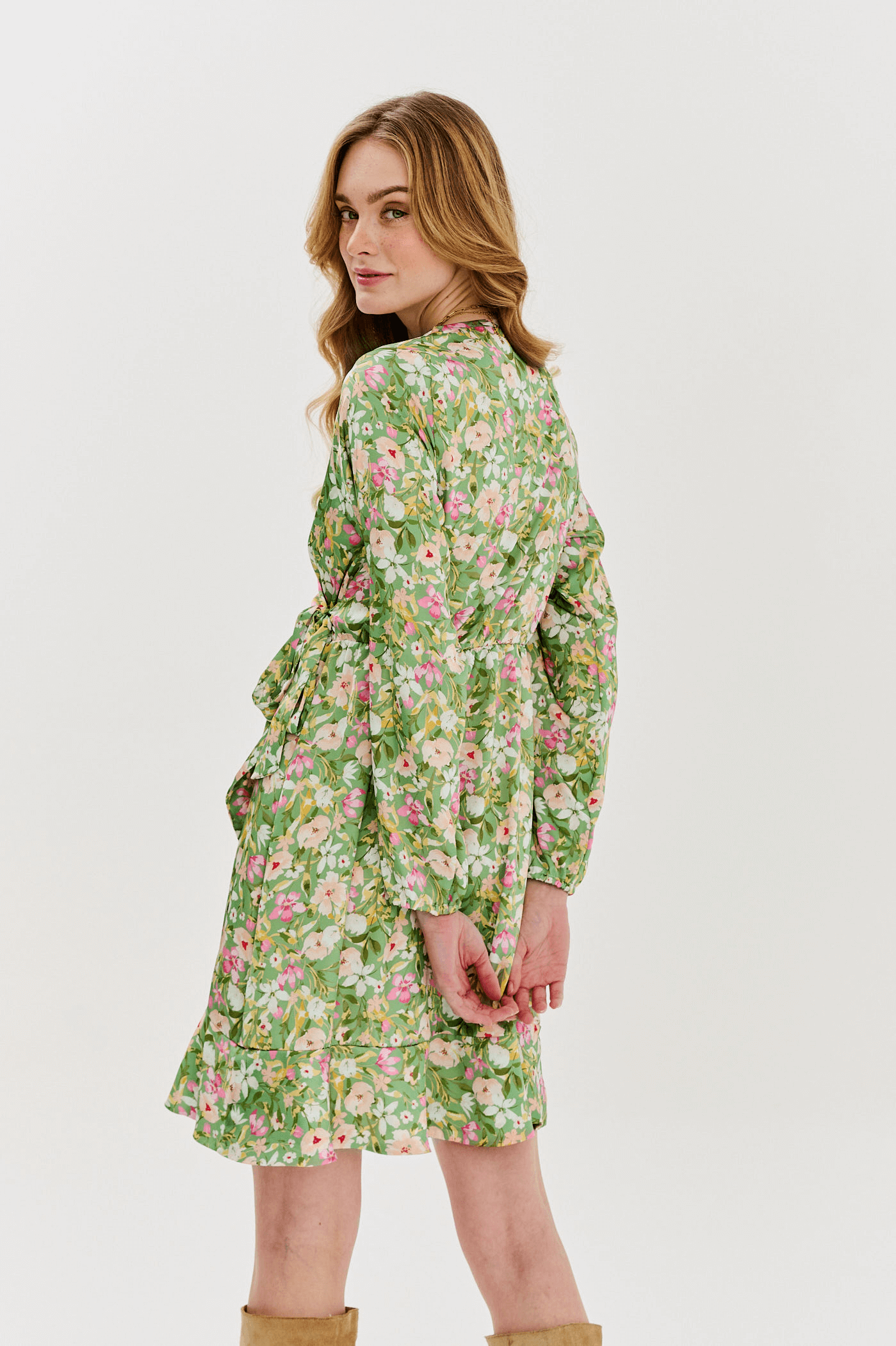 Sukienka mini Flower Spirit to połączenie romantycznego uroku i słonecznego akcentu. Jej wyrazisty kwiatowy print przyciąga spojrzenia, a kopertowy krój subtelnie podkreśla sylwetkę. Długie rękawy dodają lekkości i sprawiają, że model idealnie sprawdzi się zarówno na co dzień, jak i na wyjątkowe okazje.